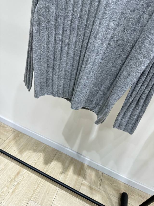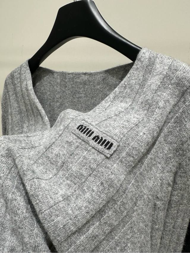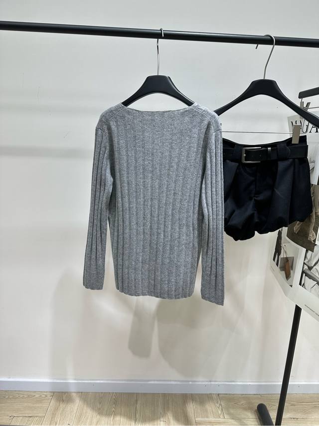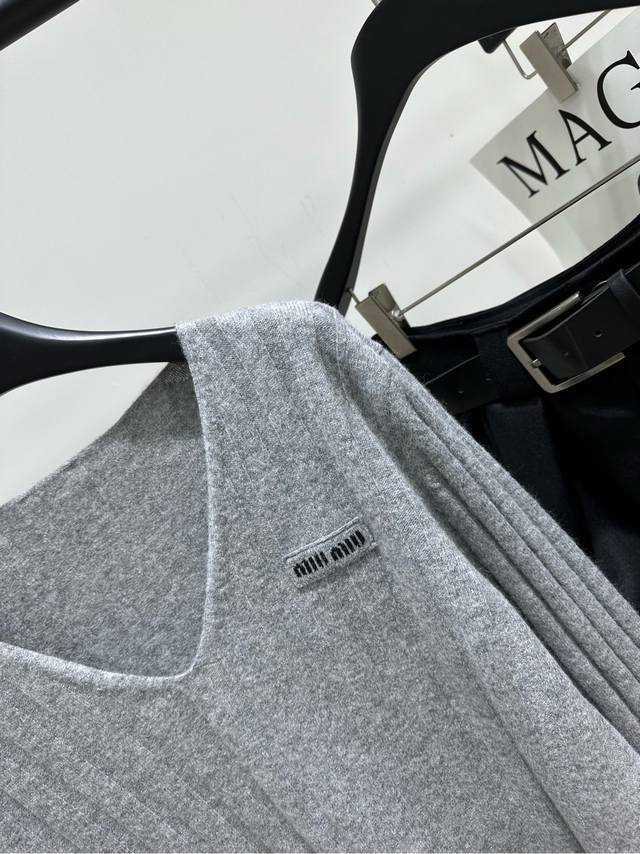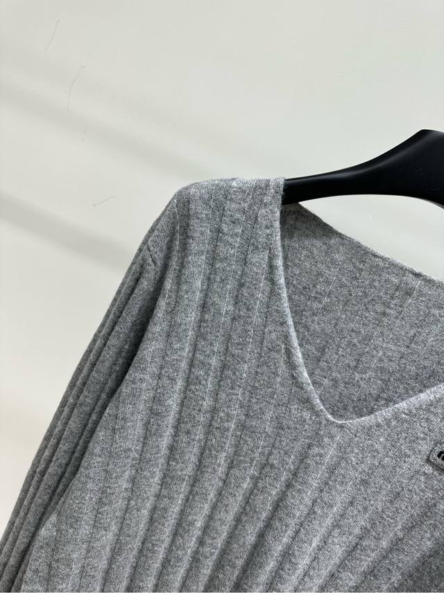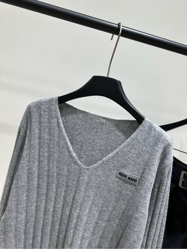M Light Gray Ribbed V-Neck Wool Sweater. Fabric: 70% Wool 30% Cashmere. Color: Light Gray. Miu Gray V-Neck Knit Sweater, Wool and Cashmere Blend. Soft and comfortable, a must-have for autumn and winter. Vertical ribbed texture + loose fit, perfect for a relaxed look. V-neck design flatters the neckline. Brand logo on the chest is highly recognizable. Gray is versatile, easy to wear for both work and leisure. Wear it alone or as an inner layer. Pair it with high-waisted pants or skirts for an elegant look. Flat Size: S: Shoulder width 42cm, Bust 98cm (elastic), Length 67cm, Sleeve 61cm. M: Shoulder width 43cm, Bust 102cm (elastic), Length 68cm, Sleeve 62cm. L: Shoulder width 44cm, Bust 106cm (elastic), Length 69cm, Sleeve 63cm. Manual measurements may have an error of 2-3 cm, which is within the normal range.