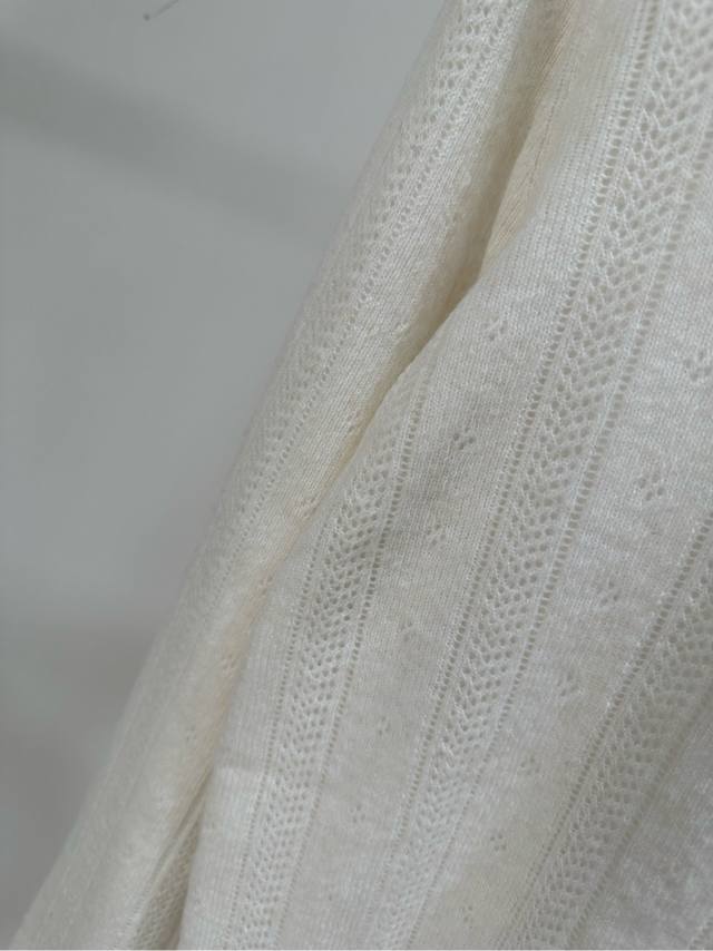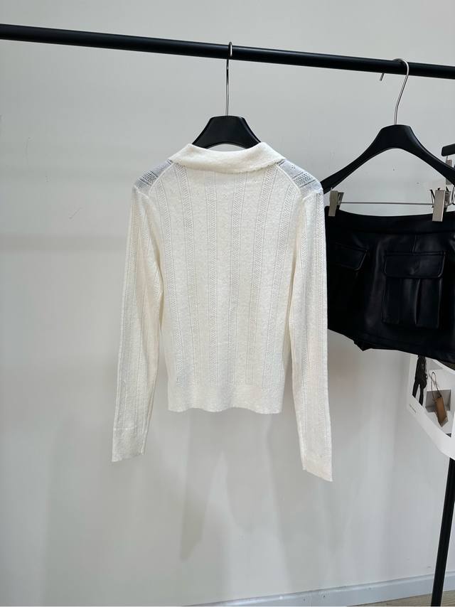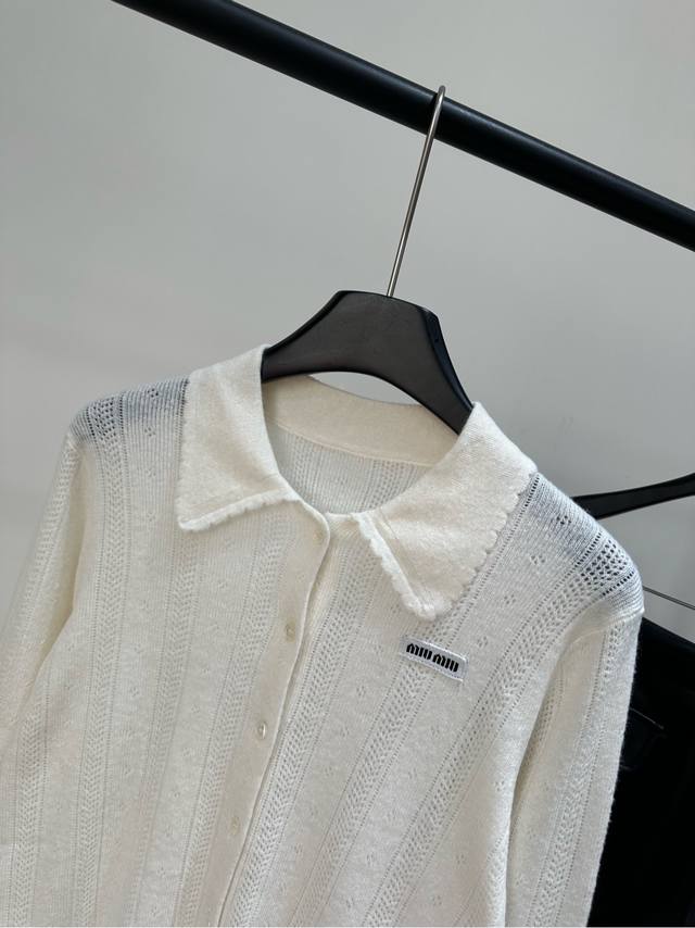 M Off-white hollowed-out lace polo knit cardigan, fabric: cashmere + mulberry silk, color: off-white. This Miu off-white hollowed-out knit cardigan is made of cashmere blend, soft and warm. It features micro-hollowed-out stripes and a small lapel design, giving it a preppy look. The brand embroidery on the left chest is highly recognizable. It's easy to wear for everyday commuting or casual occasions. It looks great with pleated skirts and jeans. A high-end fashion item, it combines quality and design, a must-have for fashionistas. Flat lay size: S: Shoulder width 39cm, Bust 84cm (elastic), Length 51cm, Sleeve length 62cm; M: Shoulder width 40cm, Bust 88cm (elastic), Length 52cm, Sleeve length 63cm; L: Shoulder width 41cm, Bust 92cm (elastic), Length 53cm, Sleeve length 64cm. Manual measurements may have a 2-3cm error, which is within the normal range.