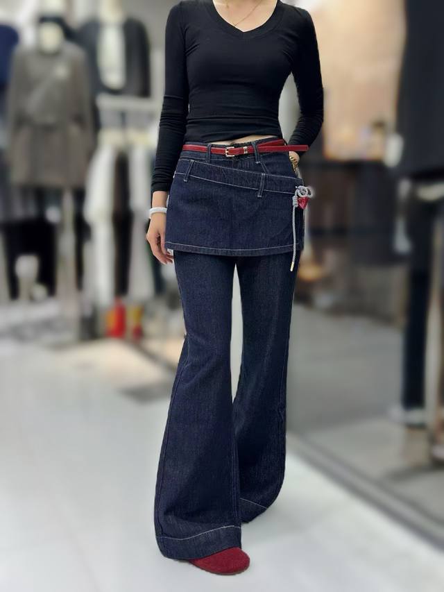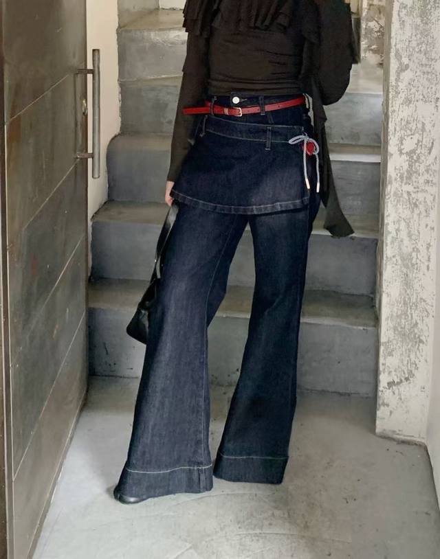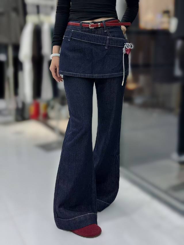 Mainly promote the hot-selling European denim suit pants, which are fashionable to the extreme! The dark blue denim fabric is retro and high-end, and the fake two-piece design is very clever. The combination of the short skirt and flared pants is unique and eye-catching, and it easily creates a sense of layering. The red belt at the waist is embellished, which is eye-catching and highlights the waistline. The flared version of the trouser legs modifies the leg shape, sways the posture when walking, and lengthens the leg line. Paired with a simple black top, it reveals a slender waist, which is exquisite and individual. Whether commuting or attending a fashion party, it can easily make you the focus and show your unique dressing taste. Smlxl