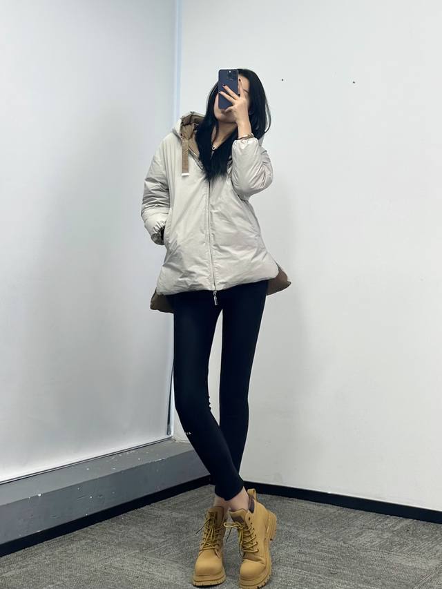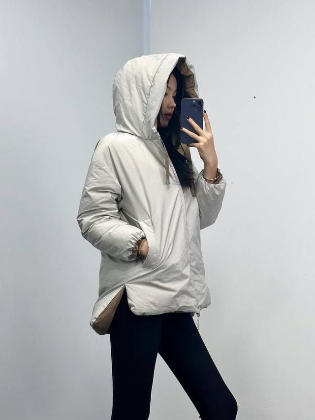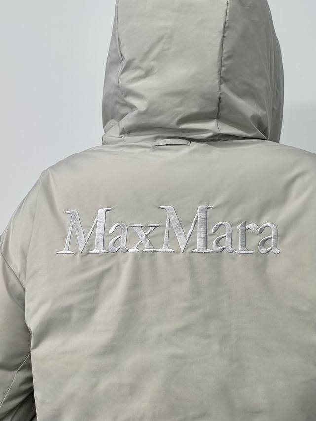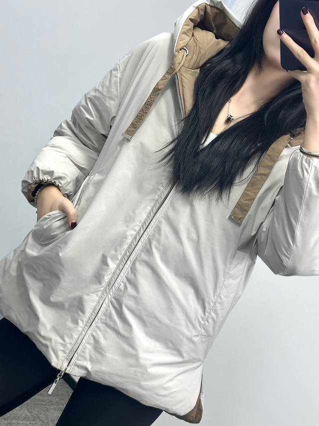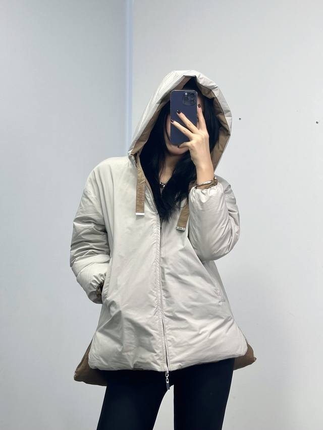 Max Embroidered Reversible Color-Blocked Down Jacket! Reversible design with silver-grey and coffee-colored letter embroidery, filled with white duck down. Sizes: Sml,