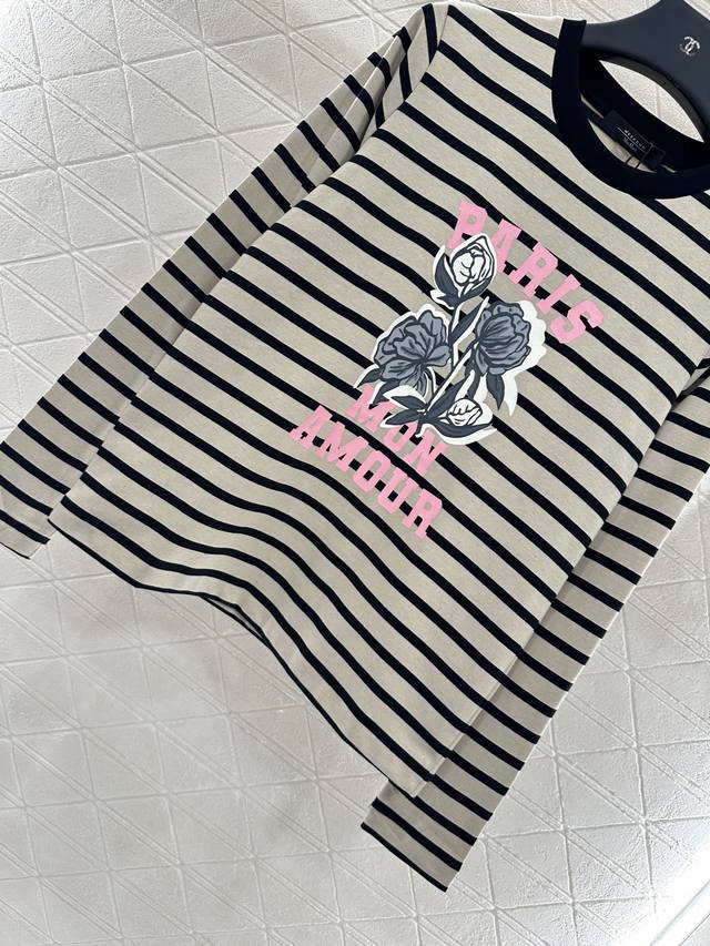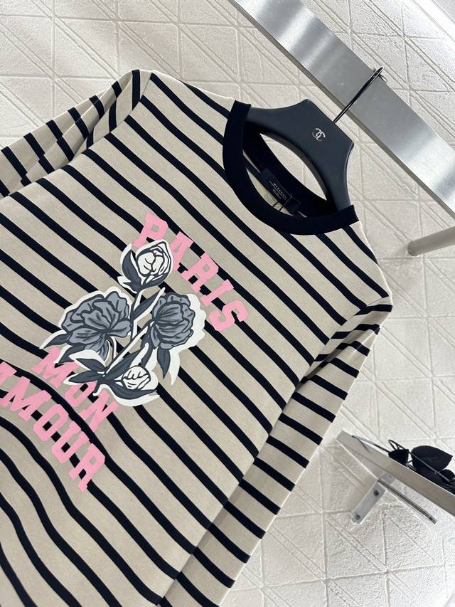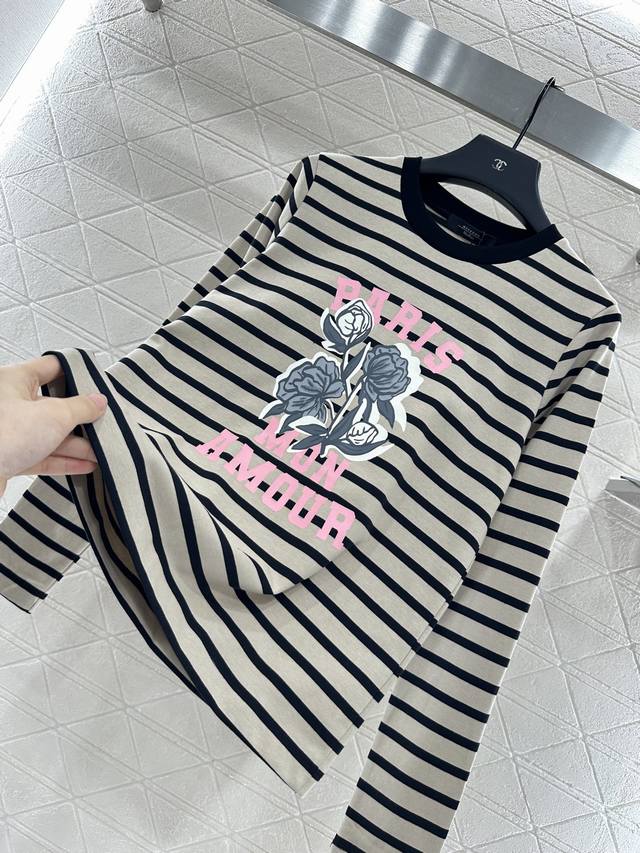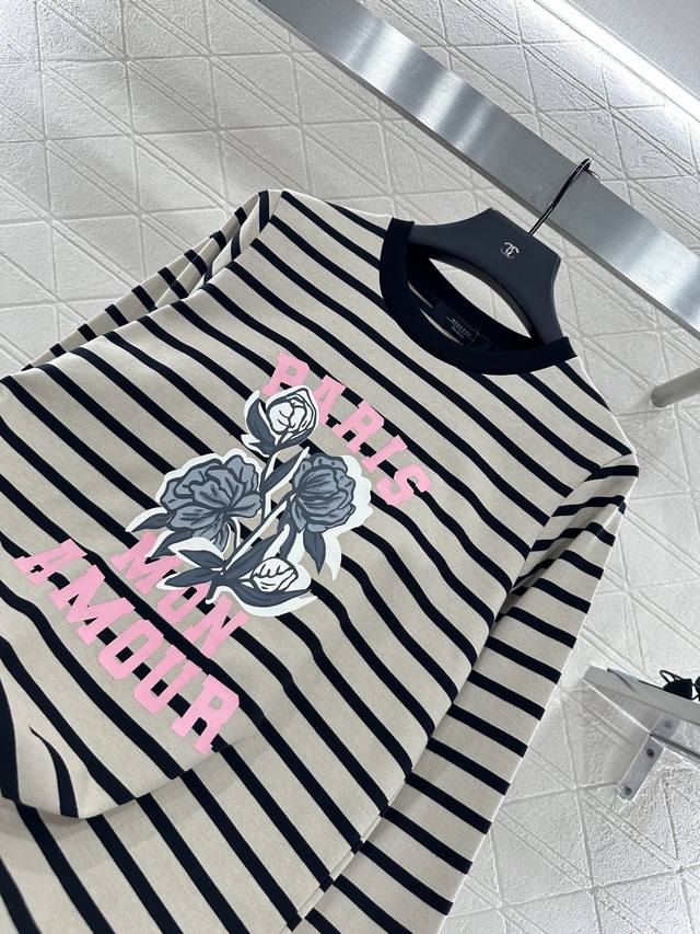 Custom Yb virgin cotton material, comfortable and stretchy. Round neck long-sleeved top with tailored neckline and threaded edging. Two-tone stripes interwoven throughout. Versatile and durable. Pink lettering and rose pattern on the chest create a striking contrast. Illustration-style decoration breaks away from the boring monotony. Loose fit, slimming and sophisticated, showing off fashion. Autumn and winter inner wear, daily commuting, dating, and leisure are all custom-made. Look for the high-end version of fabrics and accessories.