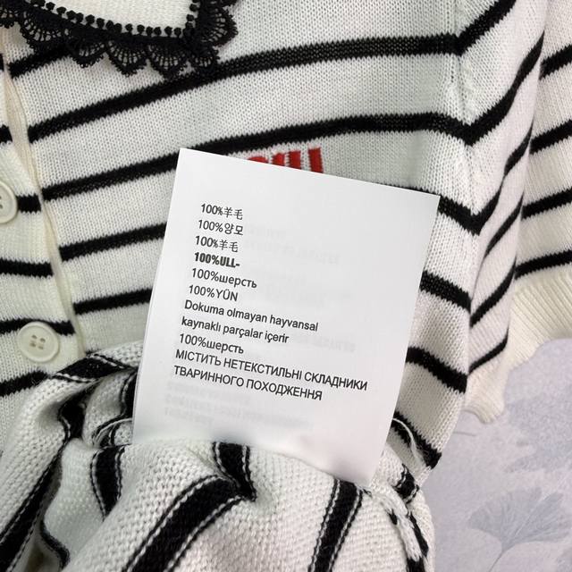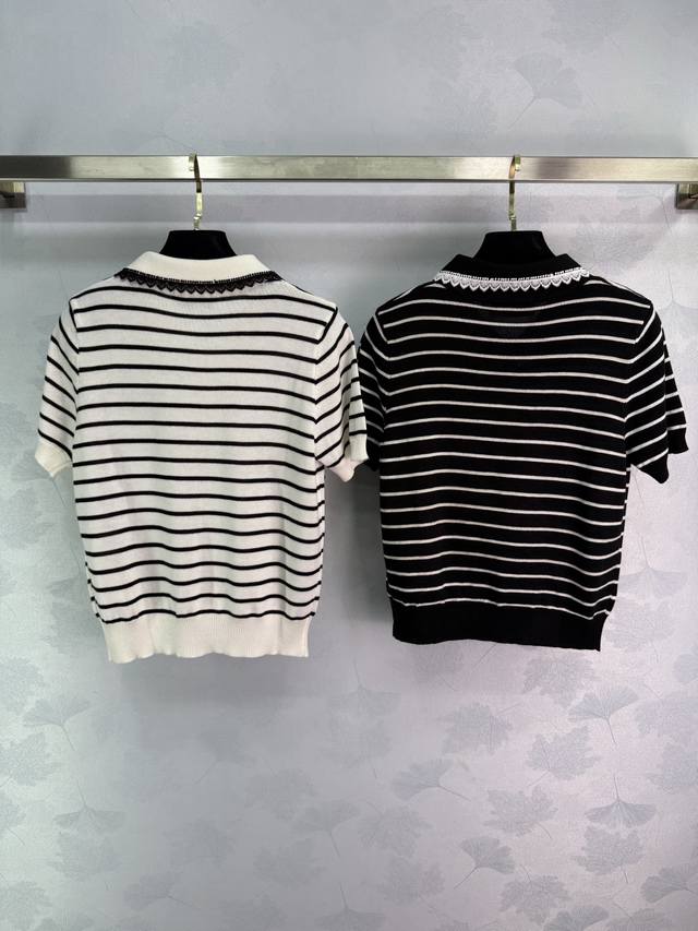 Miu* 2025 new black and white striped knit short-sleeve top features red logo embroidery on the chest and lace trim at the neckline, creating a simple and elegant look. Available in black and white, sizes S and M are available. The fabric is soft and comfortable. Perfect for spring and autumn, it pairs well with skirts or pants. T226B
