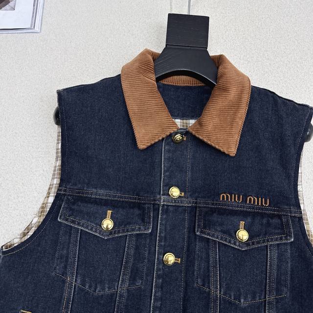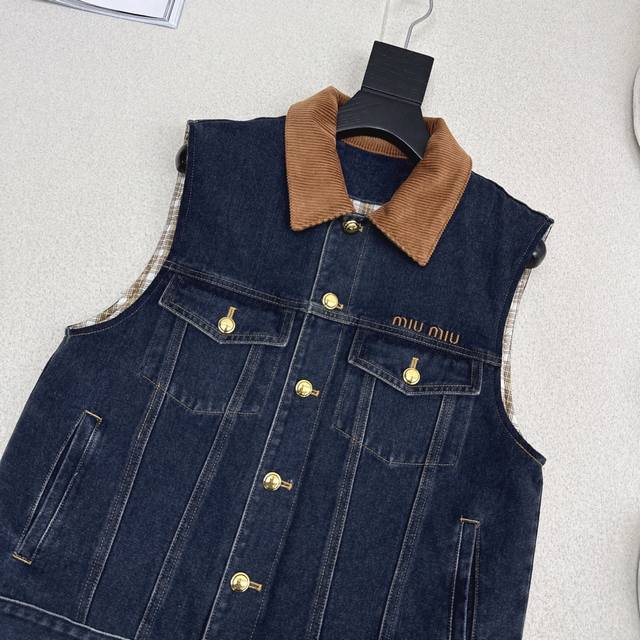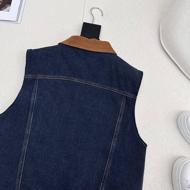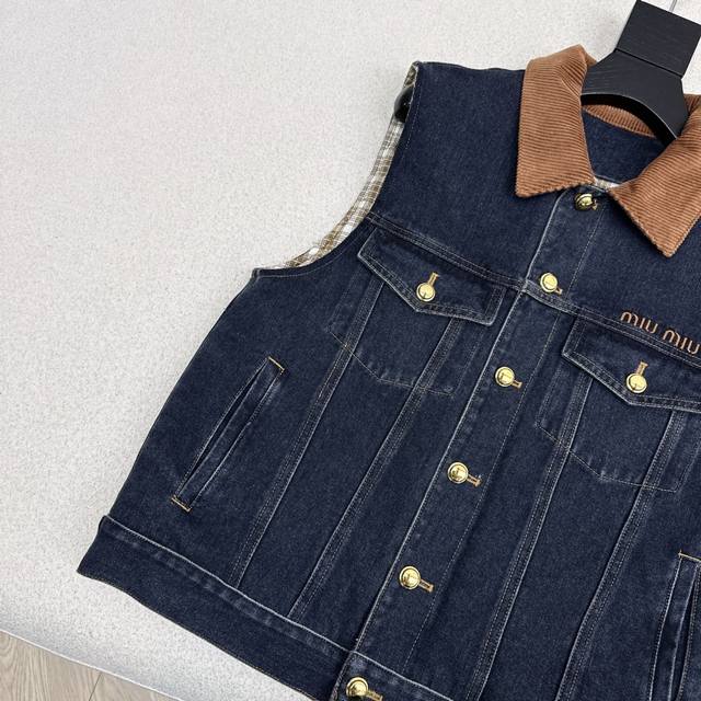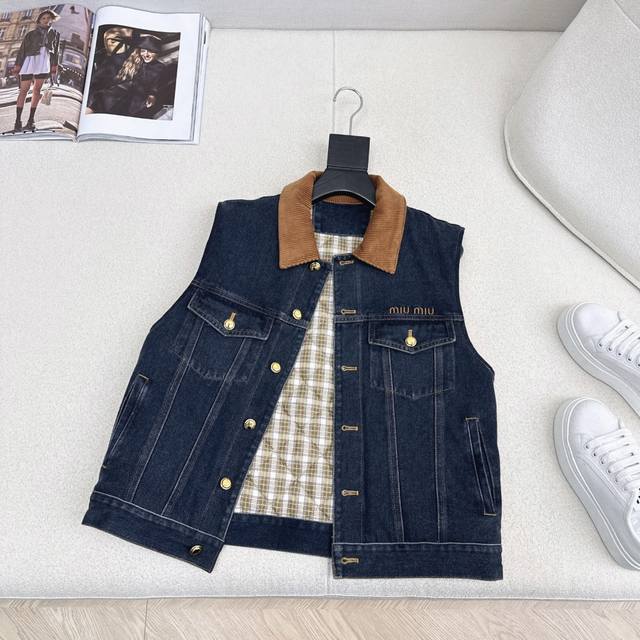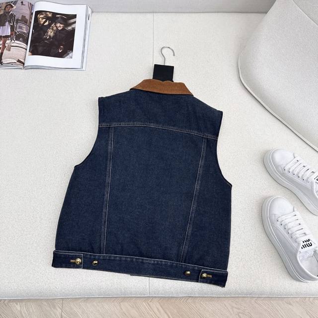 Miu 25Ss Autumn/Winter Newest Miu-style Girlish Intellectual Color-blocked Collared Denim Cotton Vest. Stylish and warm, this quilted vest is a super layering and warm essential. The classic oversized fit is incredibly slimming. A must-have for any sweet and cool fashionista's wardrobe. Available in stock in sizes S, M, and L. Size S: Bust 98cm, Length 67cm. Measurements may vary slightly due to manual measurement. DDD