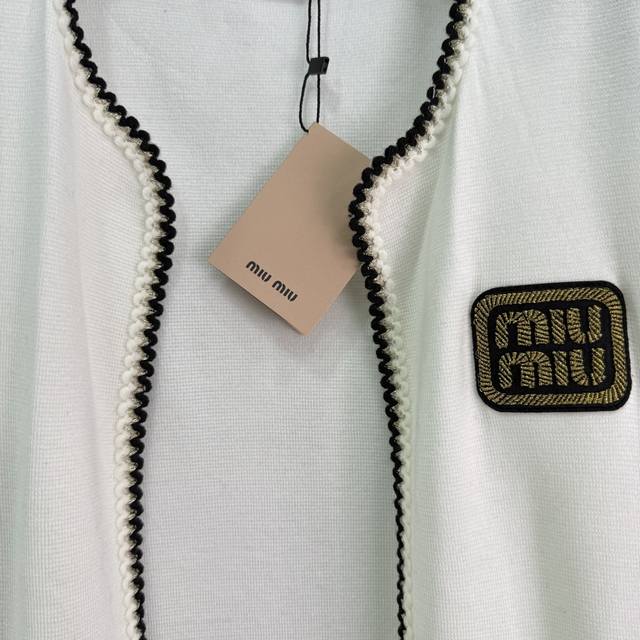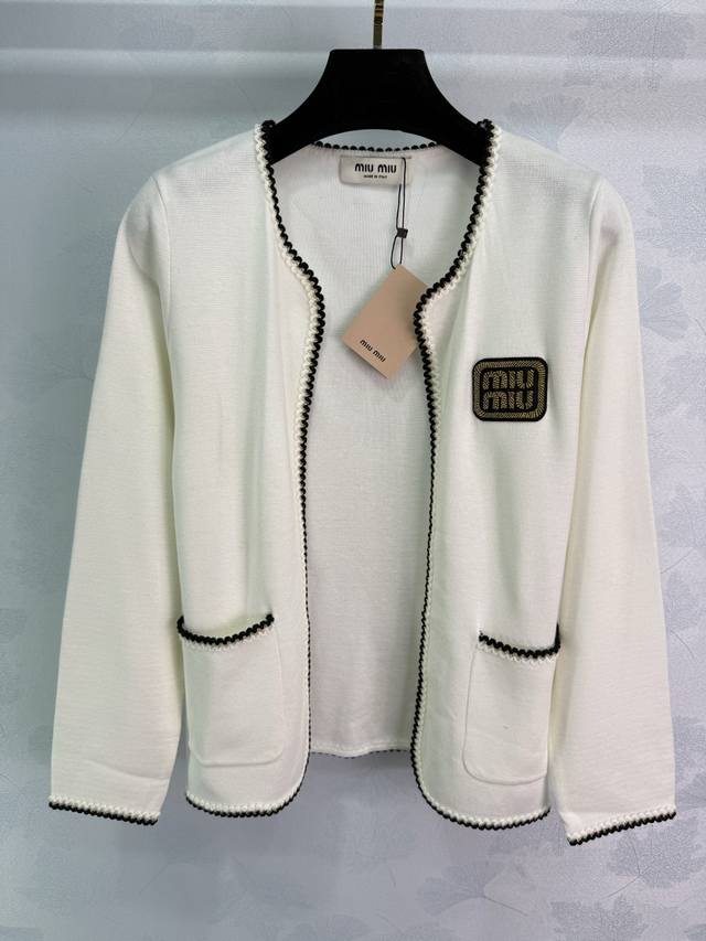 Miu Chanel-style knitted cardigan, available in white and navy blue, features a classic black and white wavy edge design, a gold logo accent, practical side pockets, and comfortable, thick fabric. Perfect for spring and autumn, it pairs beautifully with skirts or pants. T226B