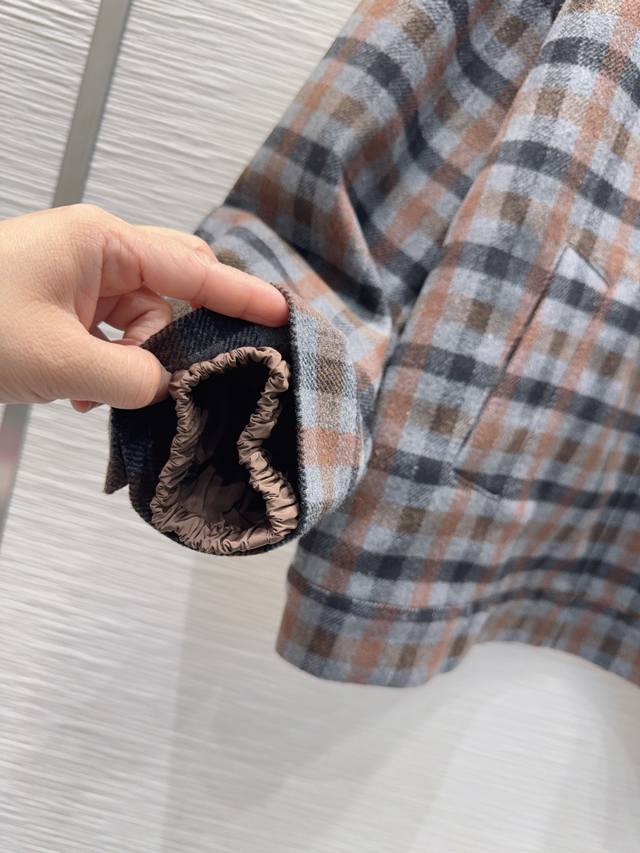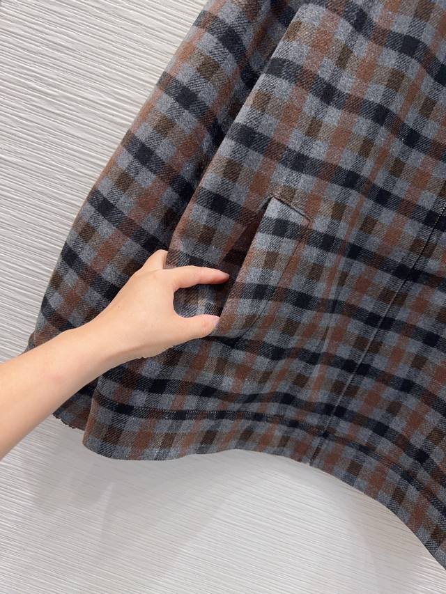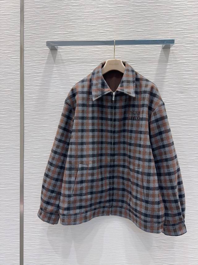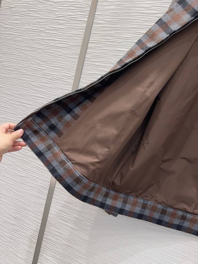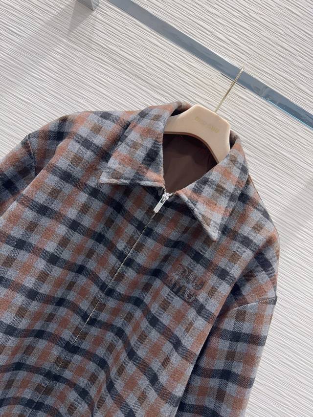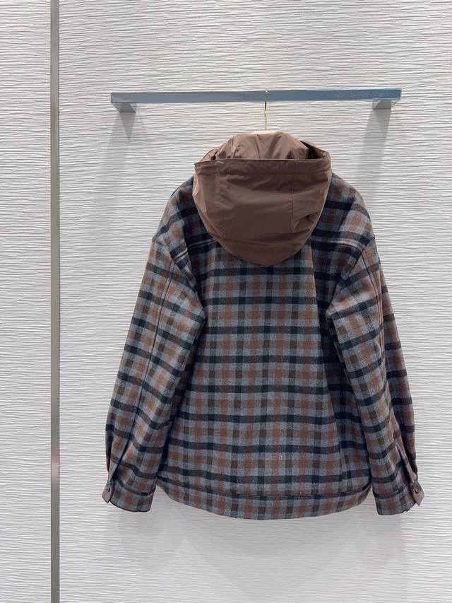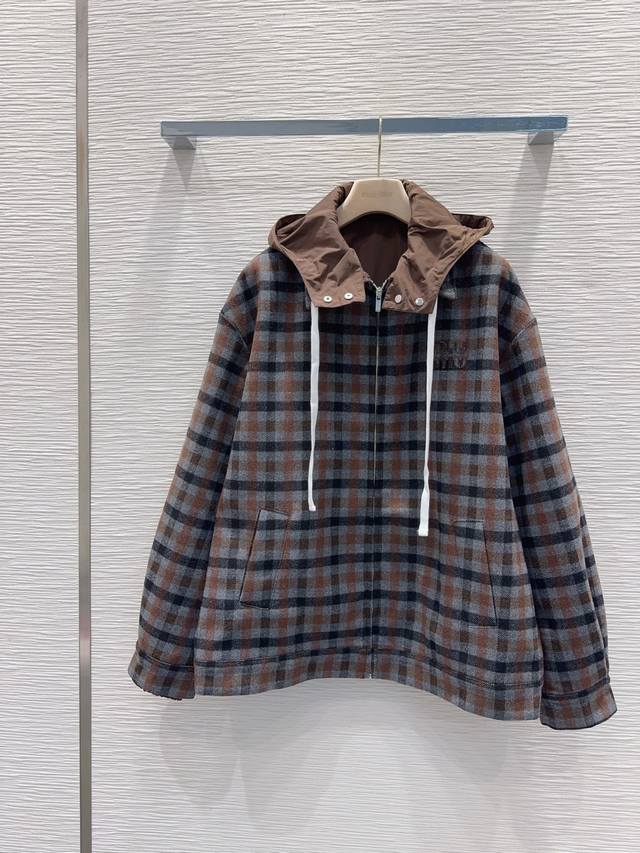 Miu Mi* 2025Fw new coat with detachable hood and classic plaid design. The fabri