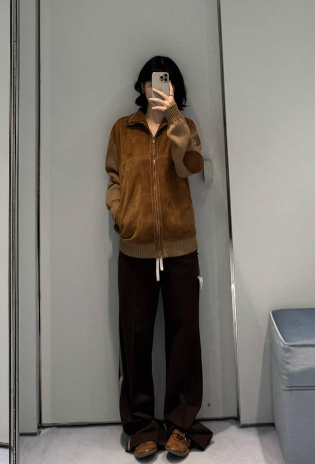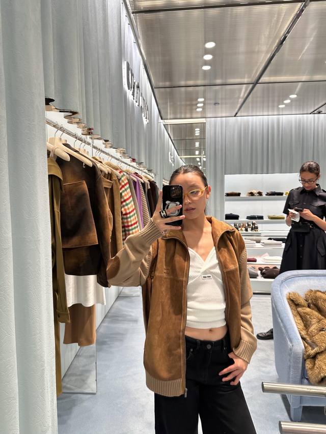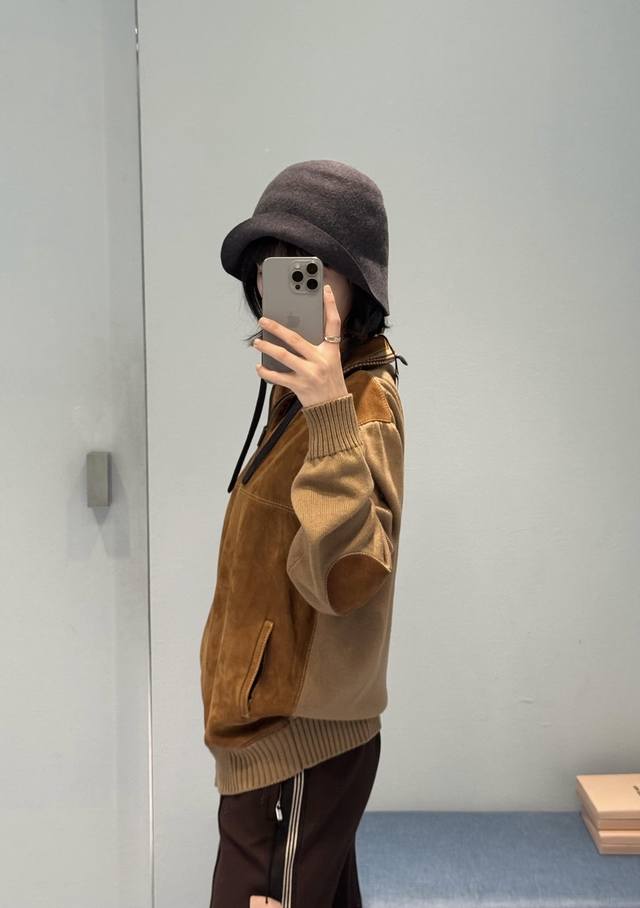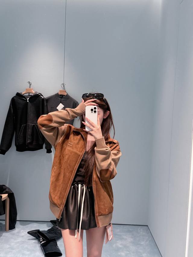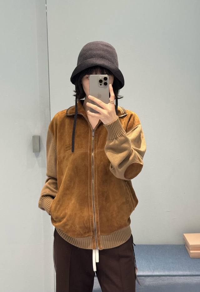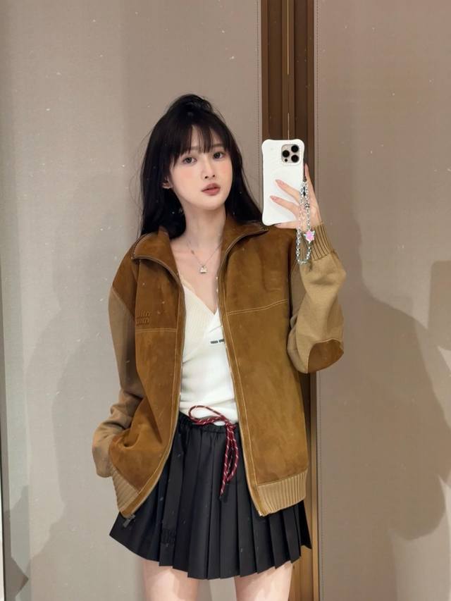 Miu Mi* 25Fw Autumn/Winter New Wool and Leather Color-Blocked Zip-Up Cardigan | Exclusive Yb Development! High-Quality Production! Made with delicate sheepskin leather with a soft, matte suede texture, offering a uniquely warm and cozy feel against the skin in autumn and winter; the stand-up collar and zip-up design allows for both loose and tight fits; the sleeves and ribbed trim are combined with wool knit, creating a slightly oversized silhouette. The soft knit texture balances the coolness of the leather, balancing warmth and casualness. The combination of the two materials allows the ruggedness and softness to blend naturally in the garment, exuding a relaxed vibe with every movement. Available now in sizes S, M, L, D.D.