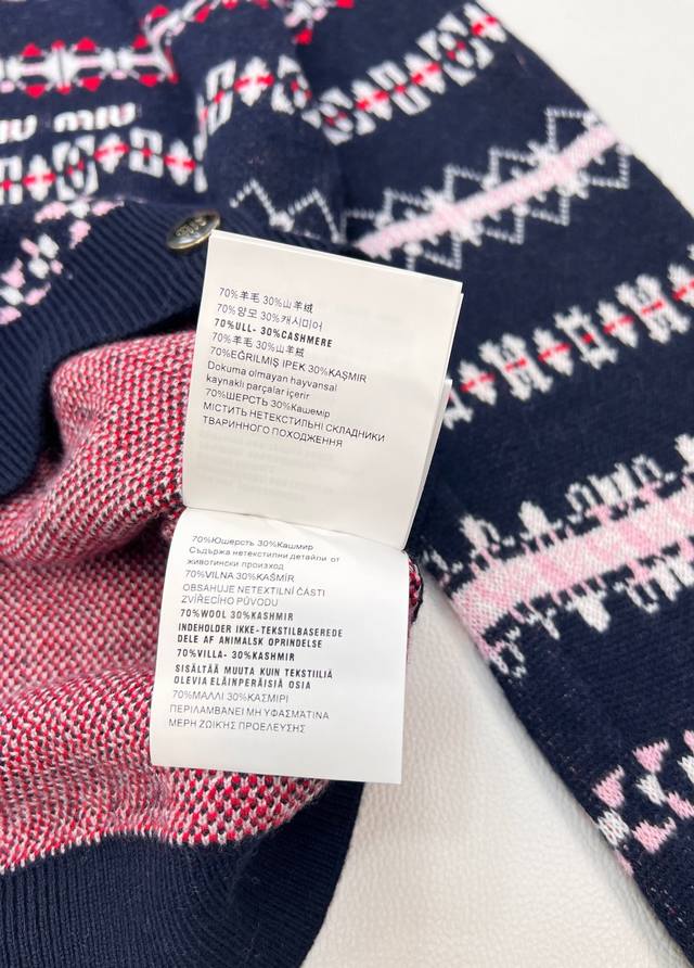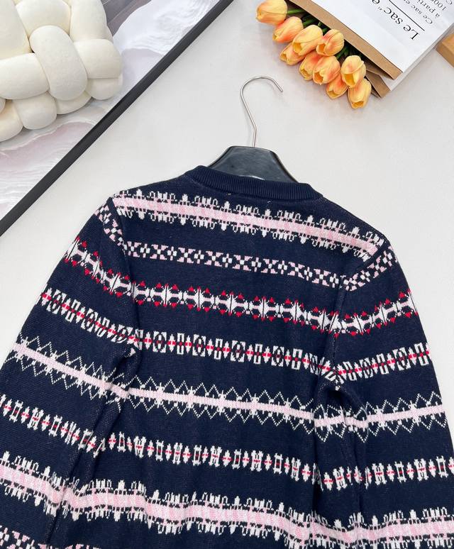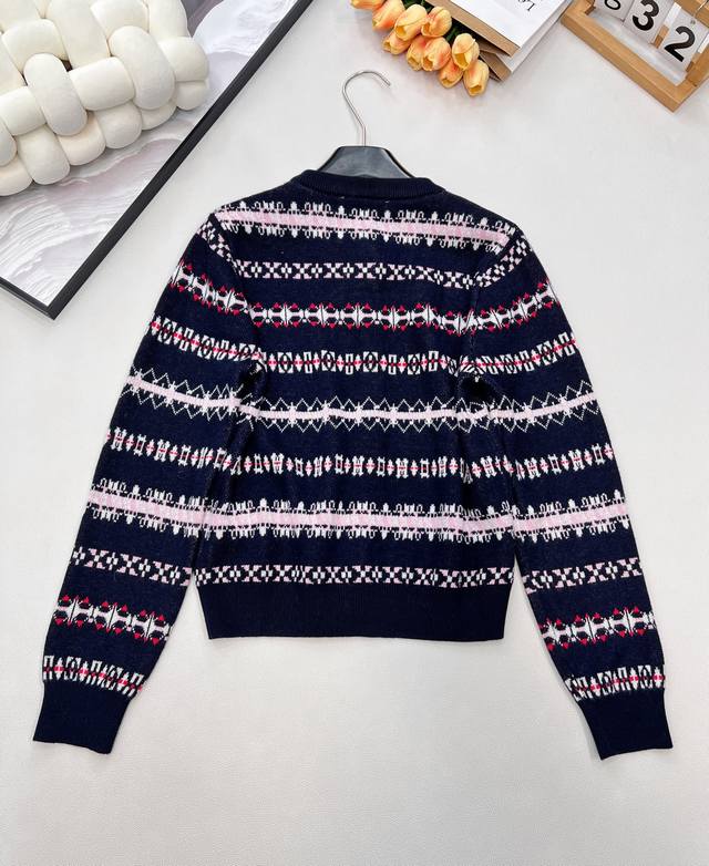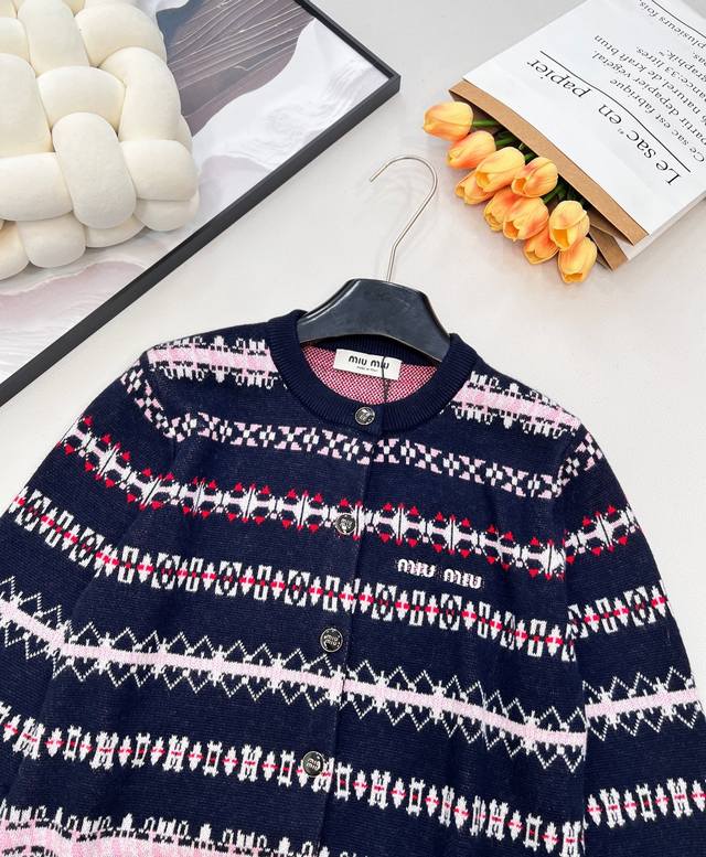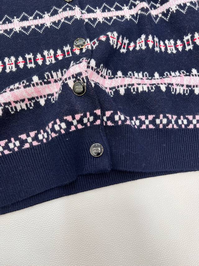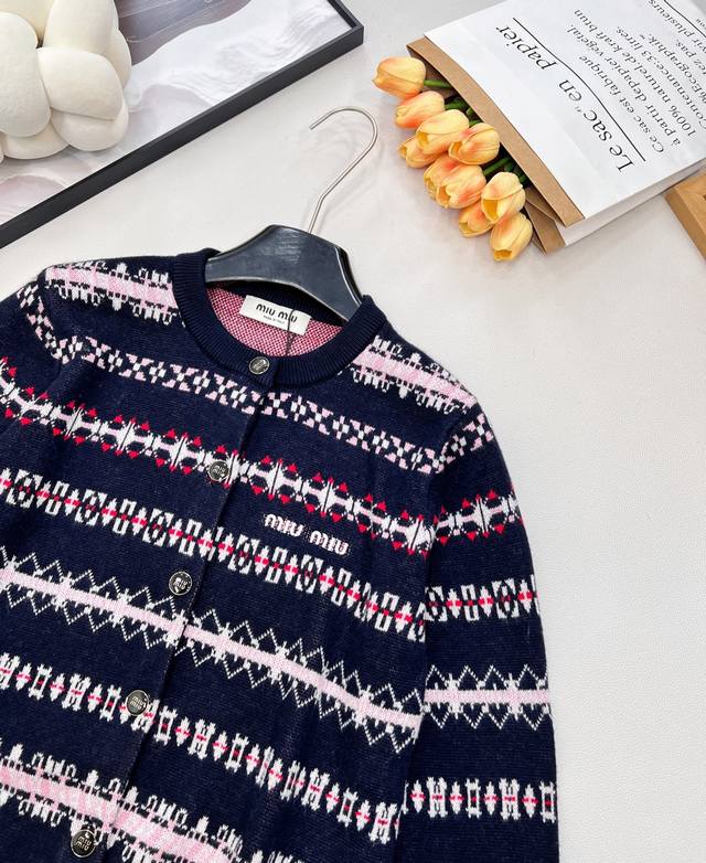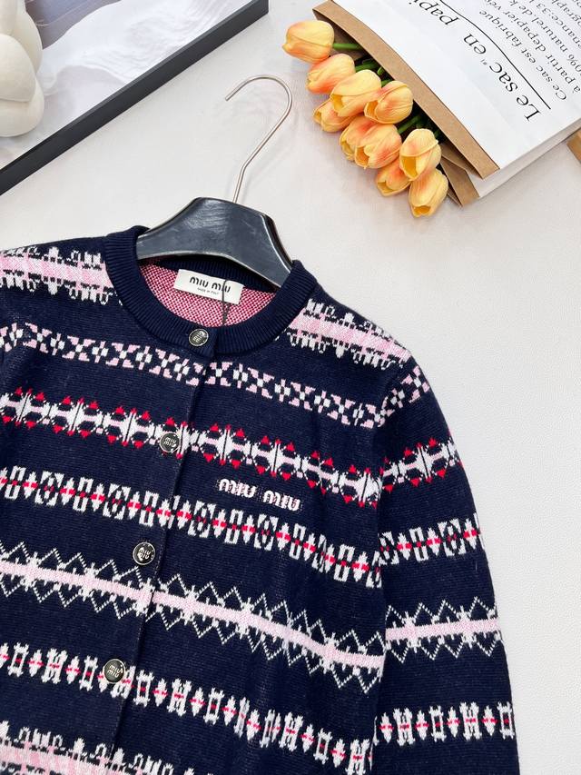 Miu Miu 2025 New Retro Jacquard Knit Cardigan, made with custom-made wool from Shaxi wool. When retro patterns meet modern knitting techniques, the cardigan features a navy blue base with pink, white, and red jacquard weaving creating a full-on artistic feel, as if wearing a retro aesthetic painting. The delicate and thick knit texture ensures both comfort and a soft feel against the skin, while adding texture and layering to the overall look. The classic round neck is versatile and flattering for all body types. Whether paired with a high-waisted skirt for a sweet and cool look or with jeans for a casual French style, it's easy to pull off. The metal buttons and the "Miu Miu" logo on the chest subtly echo each other, with every detail showcasing the brand's unique identity. Retro style lovers shouldn't miss this encounter between fashion and art! All tags are complete, bulk shipping available. Sizes S, M, L, D, Code M, D.