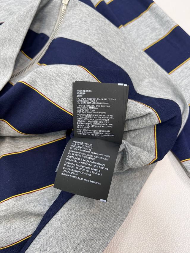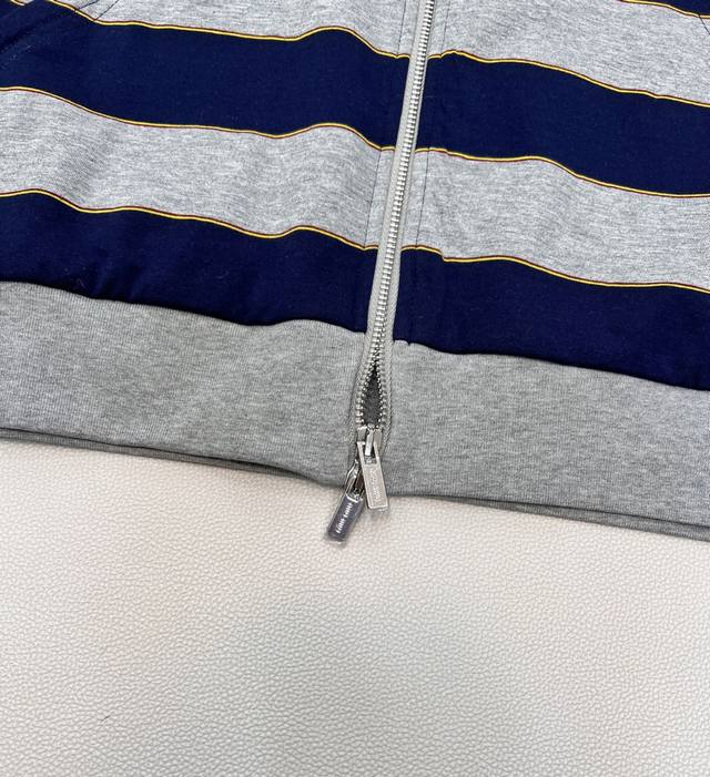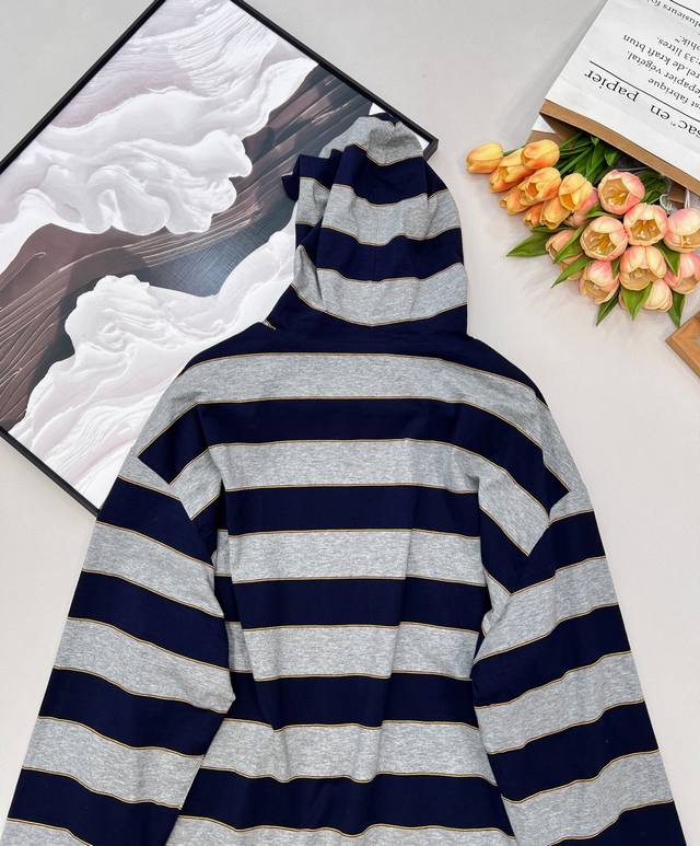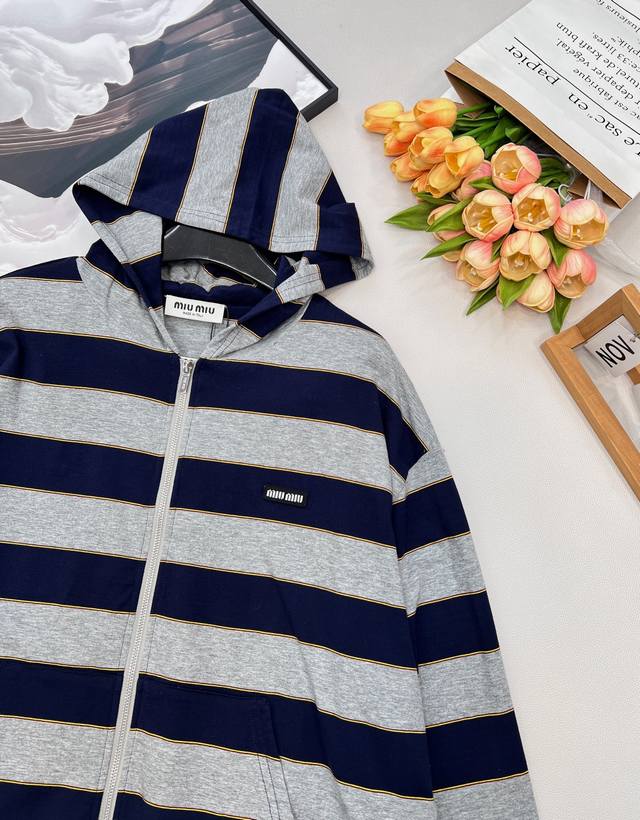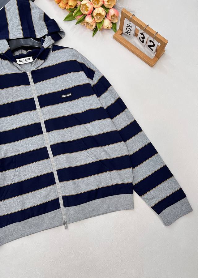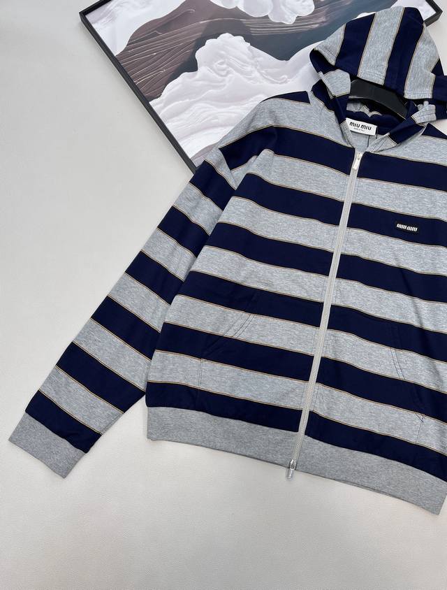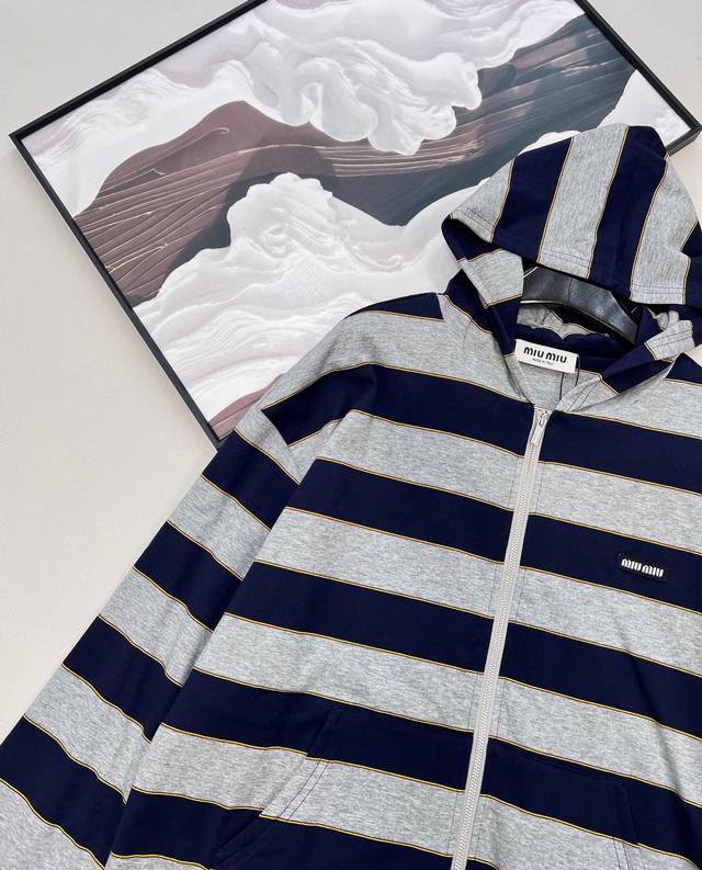 Miu Miu 26Ss Early Spring New Micro-logo Striped Zip-up Hooded Sweatshirt Jacket | Exclusive Yb Development! High-quality production! Featuring a classic navy and heather gray stripe contrast, this sweatshirt creates a chic yet sweet modern silhouette. Made from a custom high-count cotton blend fabric, it's soft against the skin, offering both airiness and structure. The relaxed, dropped-shoulder cut flatters various body types. A mini logo embroidery on the side subtly identifies the brand, while a delicate metal zipper extends along the striped texture. The hooded design adds a touch of casualness and sportiness. How can you go without this sporty and relaxed sweatshirt jacket?! The loose fit is flattering and forgiving, suitable for all body types. All tags are included. Bulk orders available. Sizes: S, M, L, C. Code: M.