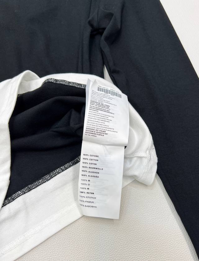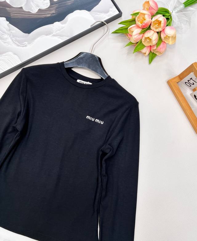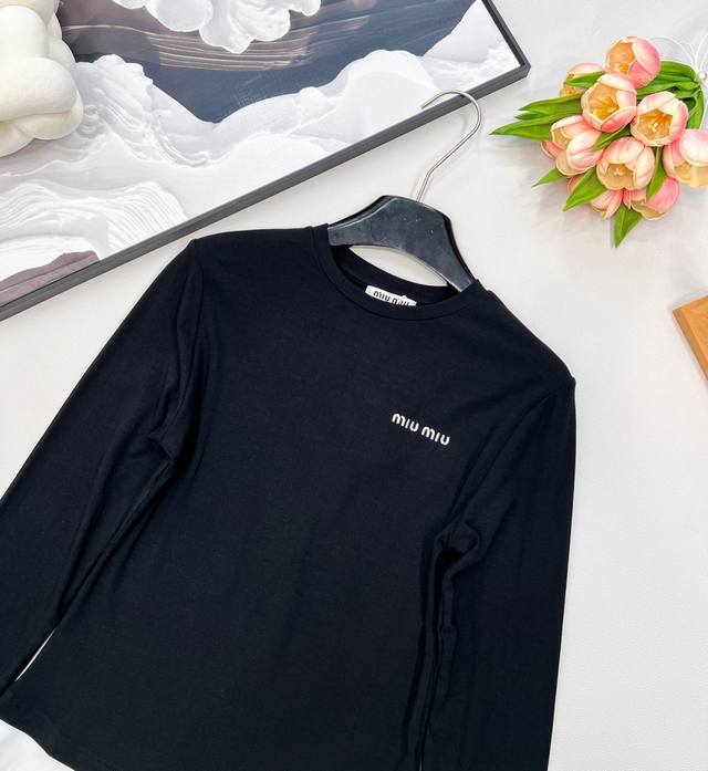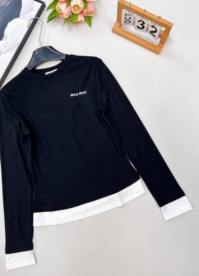 Miu Miu Autumn/Winter New Color-Blocked Faux Two-Piece Long-Sleeve T-Shirt I absolutely love this color-blocked faux two-piece long-sleeve T-shirt! The simple white body is paired with classic black trim on the cuffs and hem, cleverly creating a faux two-piece visual effect, making it incredibly stylish! The delicate brand logo on the chest subtly showcases quality and style. The slim-fit, waist-cinching design easily accentuates your figure, making it perfect for wearing alone or as an inner layer. The stretchy, soft fabric is comfortable and gentle against the skin. Whether paired with jeans for a casual look or combined with a skirt for an elegant style, it's versatile and adds a highlight to your autumn/winter outfits, ensuring you're stylish and unique this season! All tags are complete, bulk shipping available. Sizes S, M, L, Ddd. Code M, Ddd.