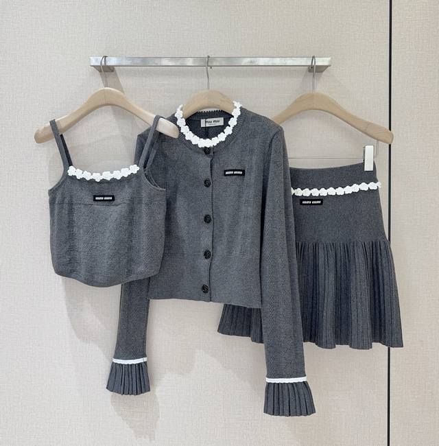 Miu Miu New Arrival Recommendation: Knitted Camisole. The knitted fabric features a white crochet lace neckline, and the simple camisole design reveals the shoulders and neck. It can be paired with a cardigan from the same collection for a look that is both youthful and sophisticated. Sizes: S, M, L.