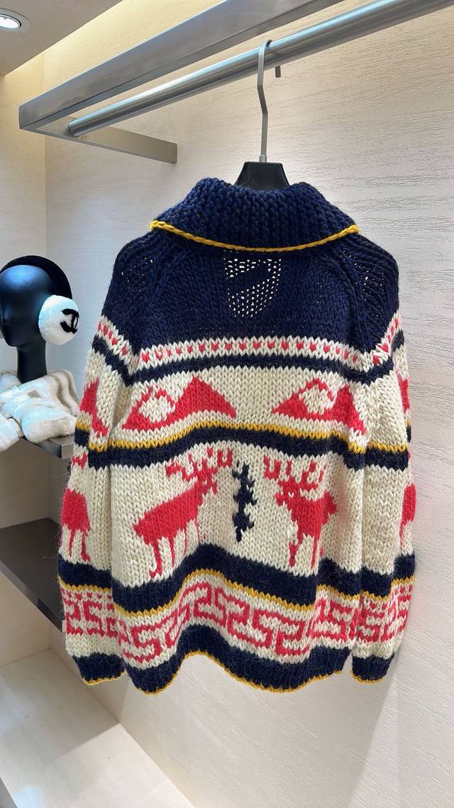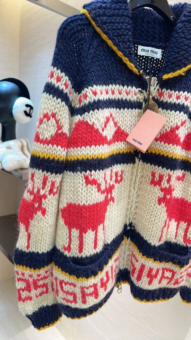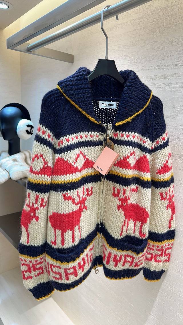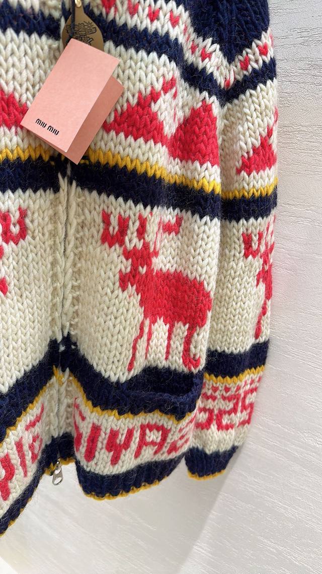 Miu Miu sweater with reindeer pattern and contrasting stripes. The soft, chunky knit has a relaxed feel. Pull up the turtleneck and casually slip on some sweatpants for a K-pop idol street style look. Perfect for a "lazy beauty" look this fall and winter! Sizes: S, M, L, D, D