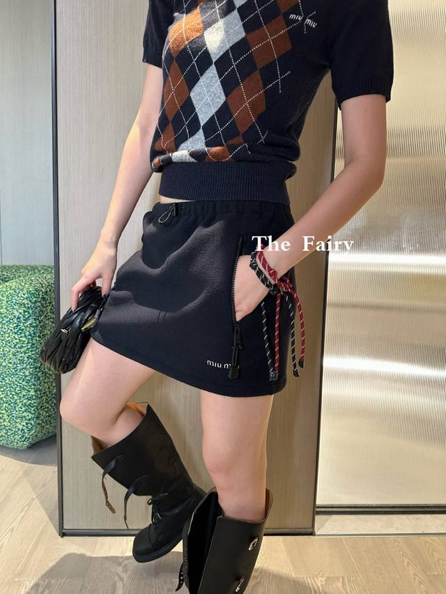 Made of black fleece with brand logo embroidery Two front zippered pockets with drawstring Elastic waist Hip-hugging design to highlight the curves Recommended to match with the series jacket
