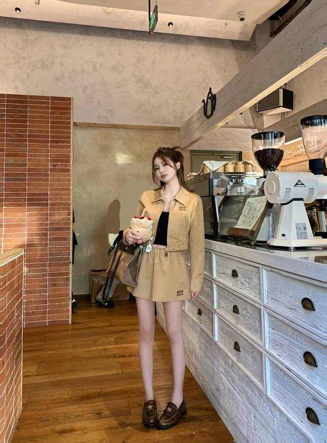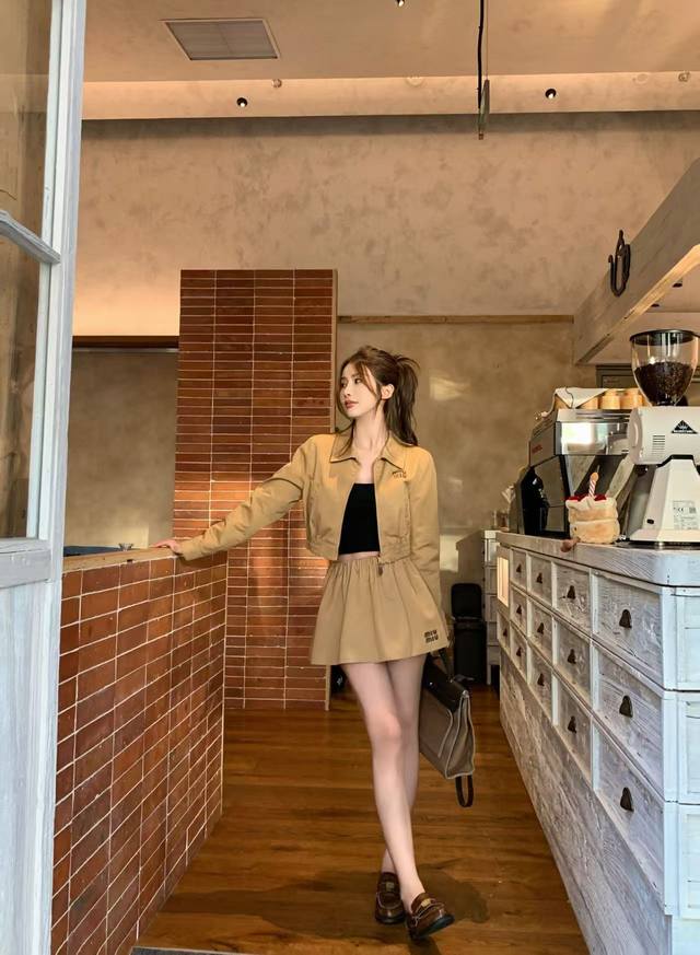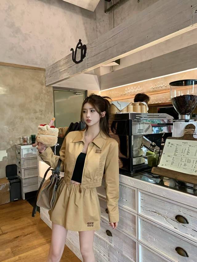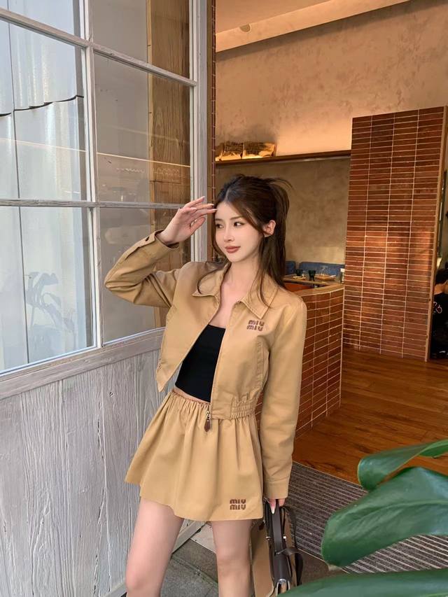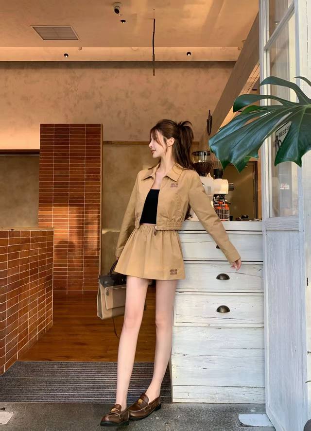 25th year early autumn series Miu's latest lapel long-sleeved short jacket with elastic waist short skirt suit leather letter patch embroidery embellishment