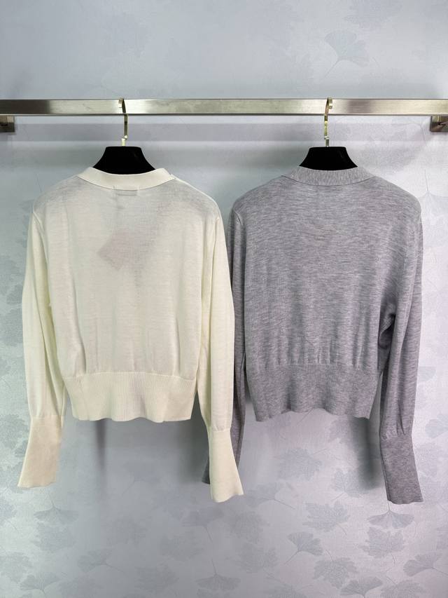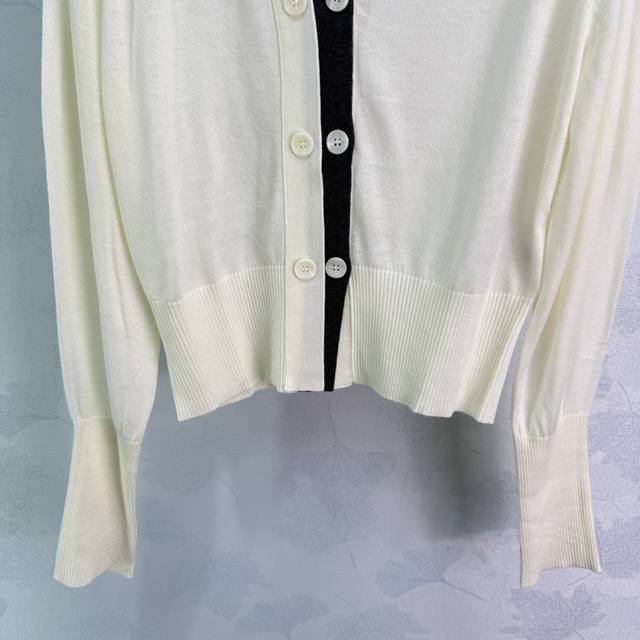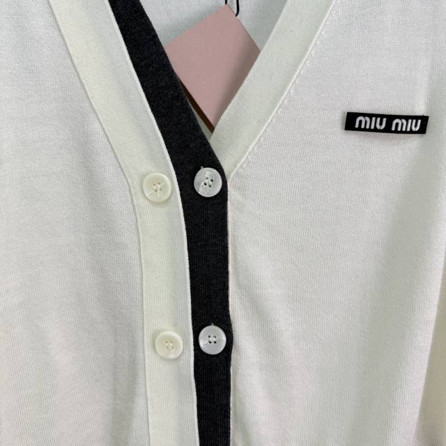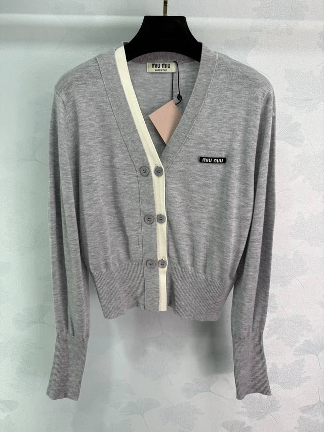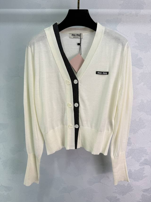 Miu*2025 Early Autumn New V-neck Knit Cardigan. Simple and elegant design with color blocking, logo embellishment on the chest, and single-breasted design. Looks amazing on! 2 colors, 3 sizes: S, M, L, D.