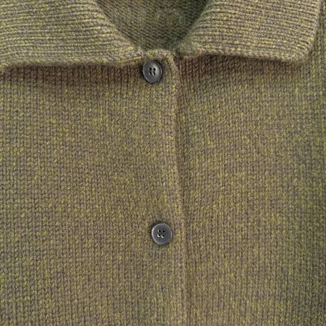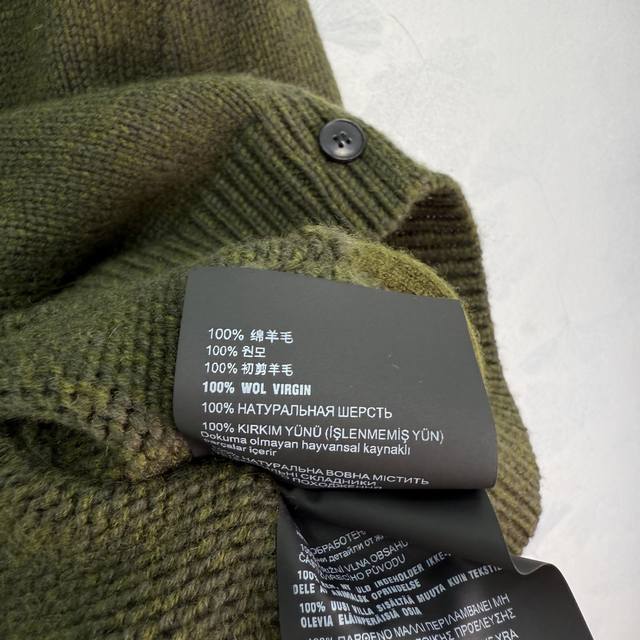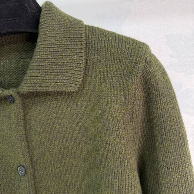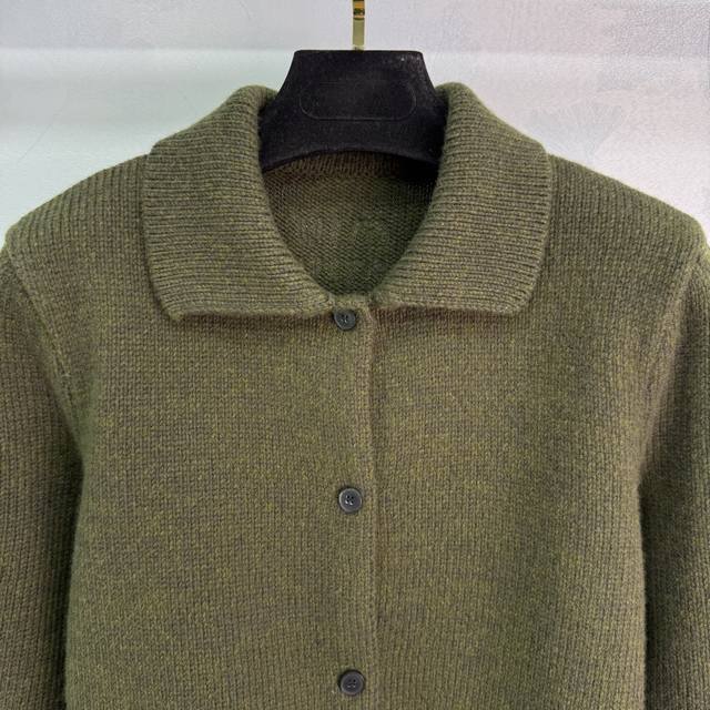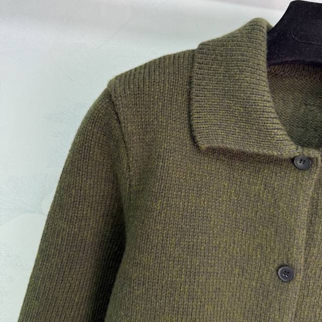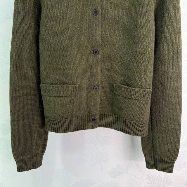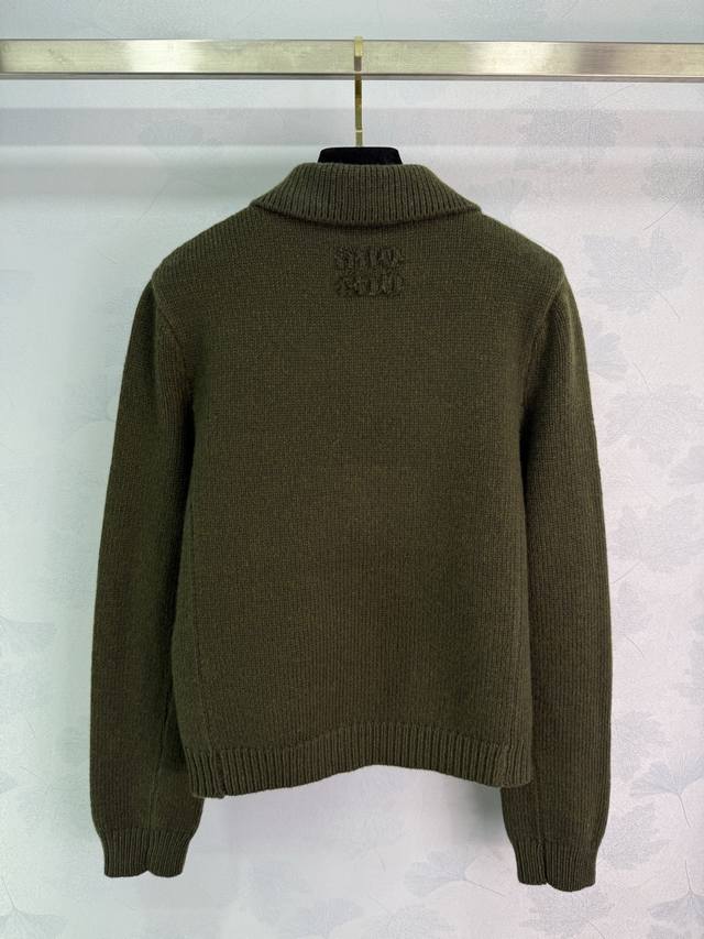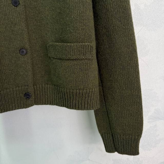 Miu*25 Autumn/Winter New Army Green Wool Cardigan, 100% Pure Wool Fabric, Soft and Comfortable. Features a turn-down collar with front buttons, side pockets, and a simple yet elegant brand logo embroidery on the back. A must-have item for your autumn/winter wardrobe. Available in 3 sizes: S, M, L, DDD