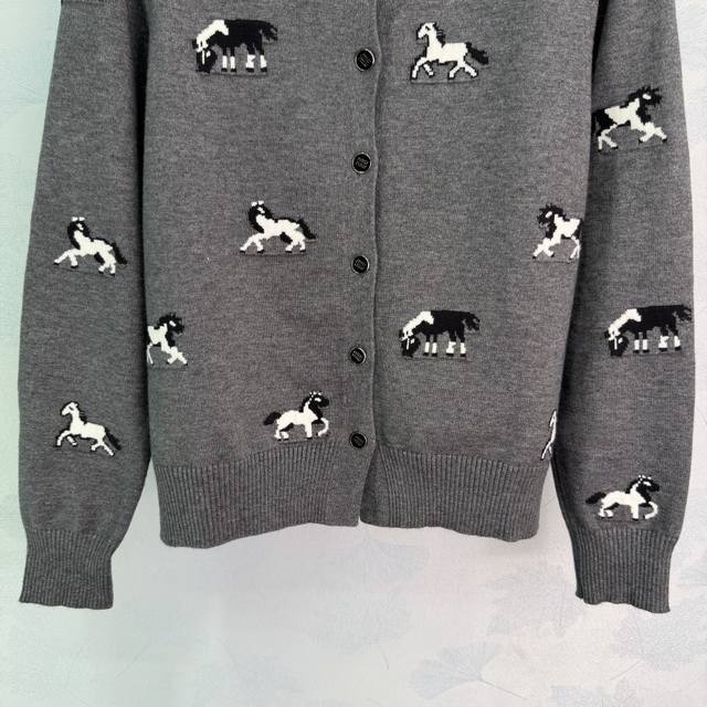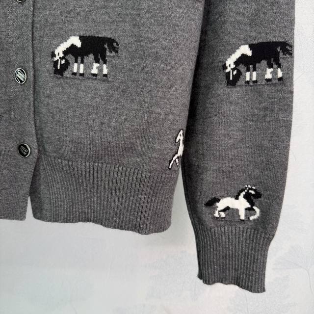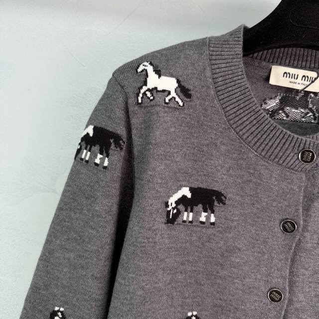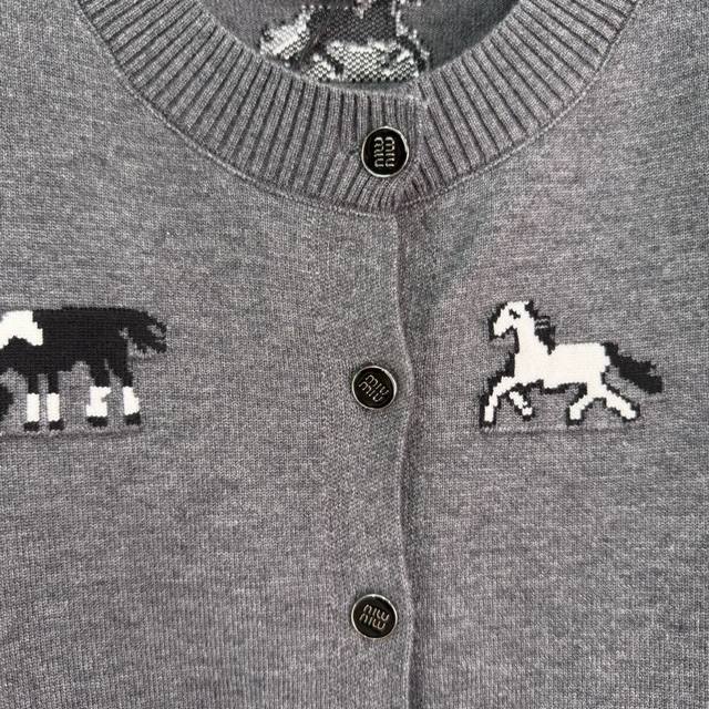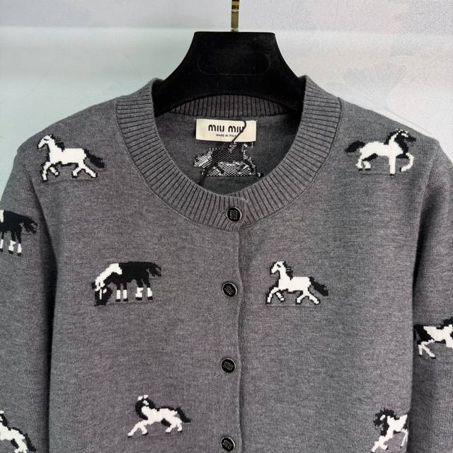 Miu*25 Autumn/Winter New Gray Horse Pattern Knit Cardigan. Made of high-quality knit fabric, soft and comfortable. Features a round neck and black buttons for easy on and off. The horse pattern is playful yet retro, making it incredibly stylish.