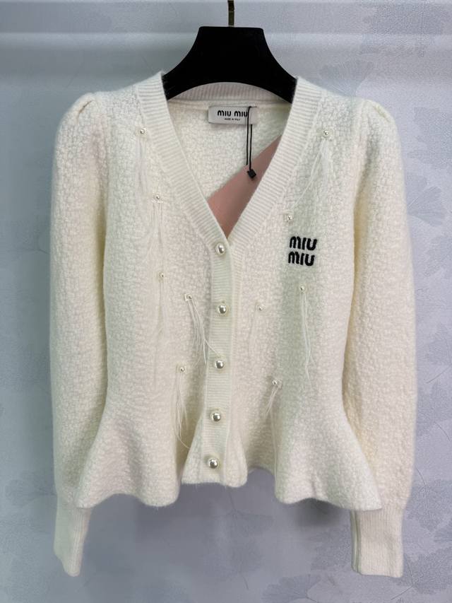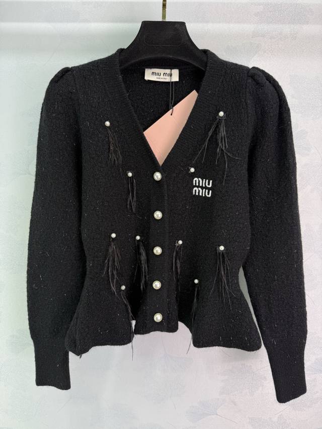Miu*25 Autumn/Winter New Pearl Button Tassel Knit Cardigan. V-neck design exudes elegance, puff sleeves and a slimming waist. The ruffled hem adds a touch of design flair. Pearl buttons embellish the elegant and sophisticated look, while the tassel decoration is fashionable and unique. It looks great with skirts or pants! 2 colors , 3 sizes: S, M, L, T226B. DDD