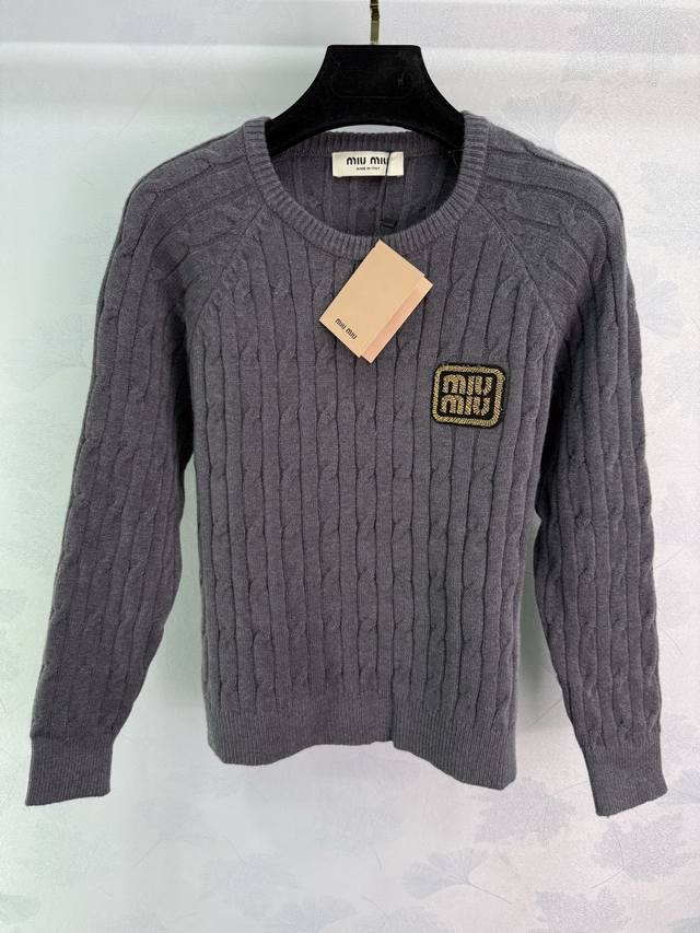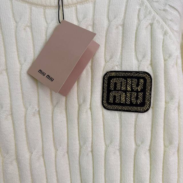 Miu*25 Early Autumn New Cable Knit Sweater with Classic Logo Badge Design on Chest. Fabric: 70% Wool + 30% Cashmere, soft, comfortable, and textured. Exquisite cable knit texture, slim fit, a must-have for autumn and winter! 2 colors, 3 sizes: S, M, L, T226B. DDD