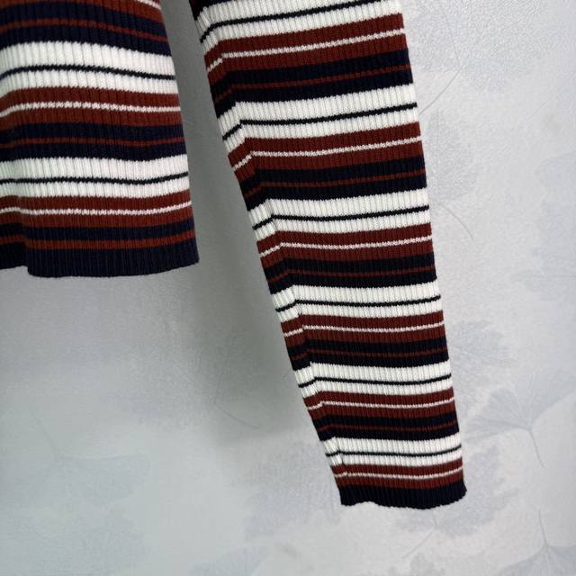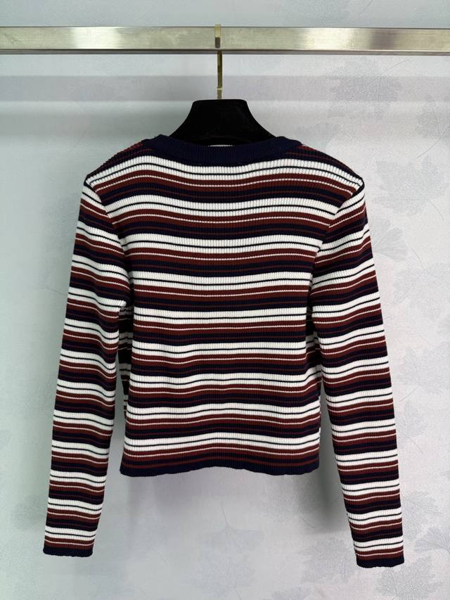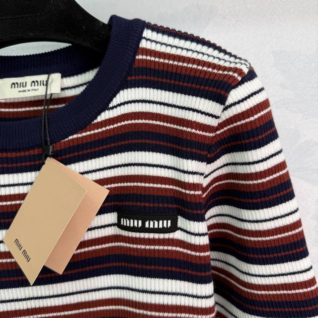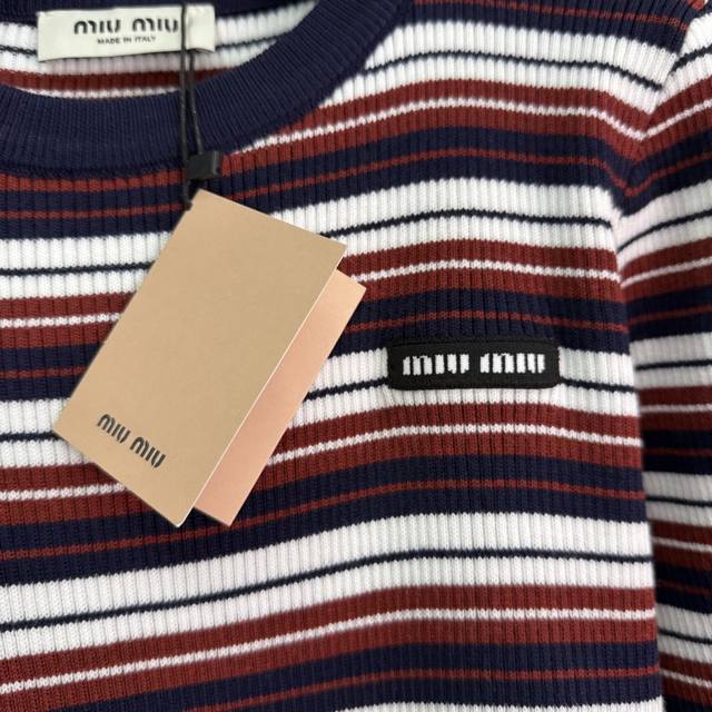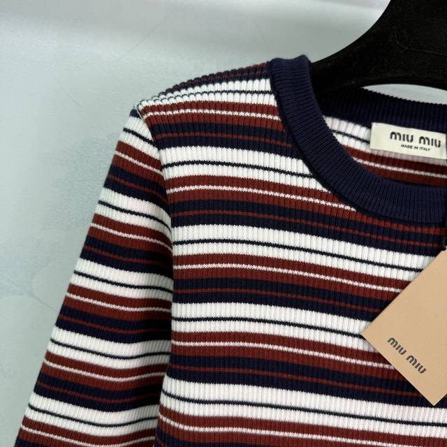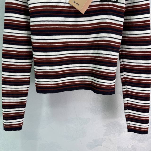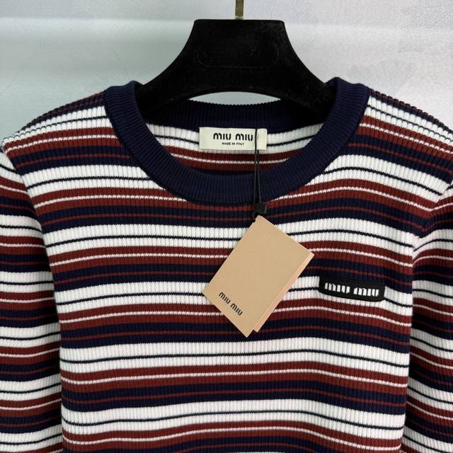 Miu*25 Early Autumn New Striped Knit Long-Sleeved Top with Embroidered Logo on Chest and Color-Blocked Stripes. Very preppy style. Overall condition is excellent. Simple yet high-end, fashionable and versatile. Available in 1 color and 3 sizes: S, M, L.