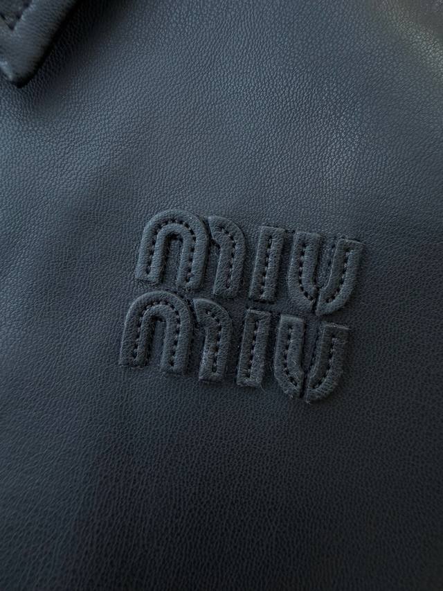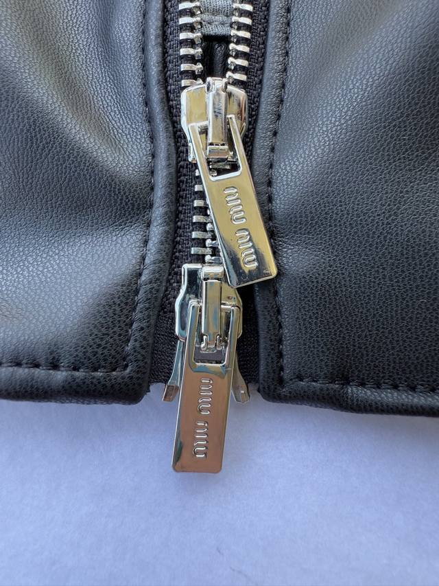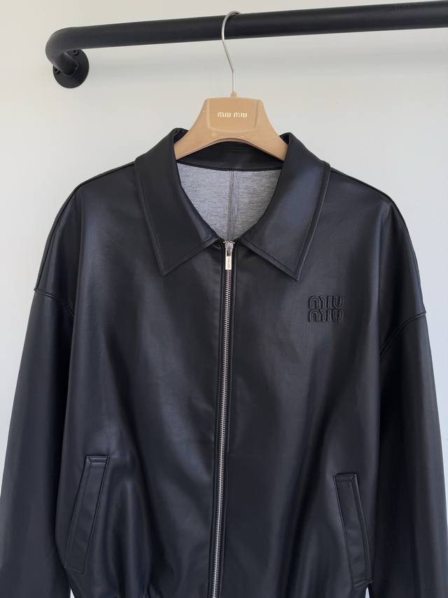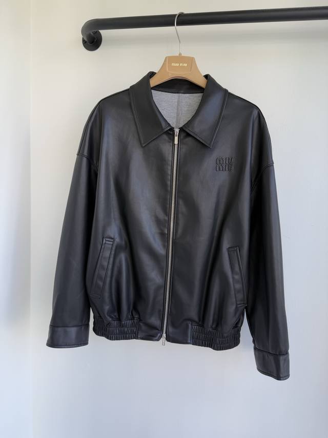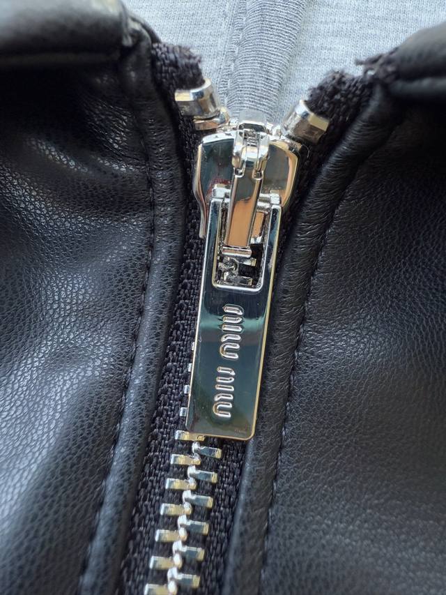 Miu25 Early Fall 2025 Nappa Leather Zipper Jacket Shipping. Soft Nappa leather combines with iconic knit fabric to create a sophisticated garment that expresses unrestrained rebellious charm with raw edge details and a relaxed fit. In stock: 36 38 40