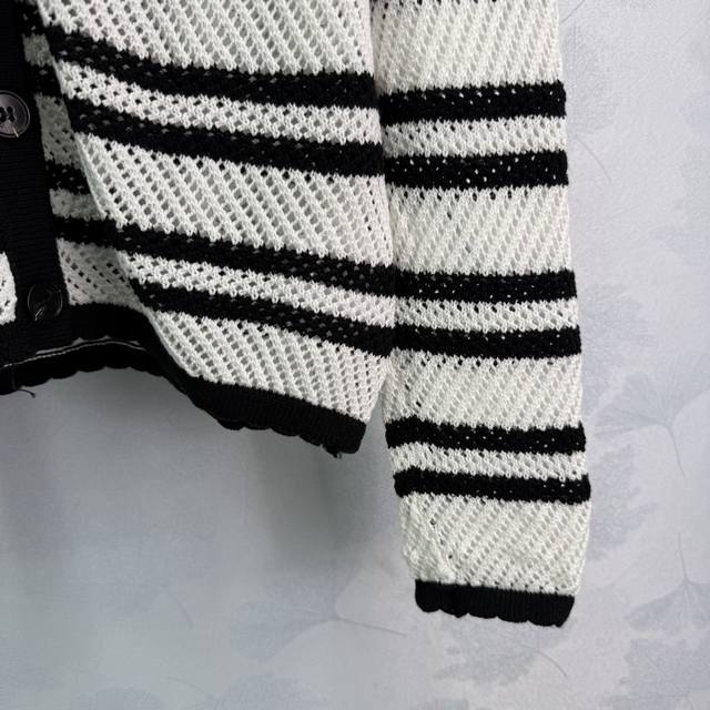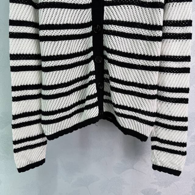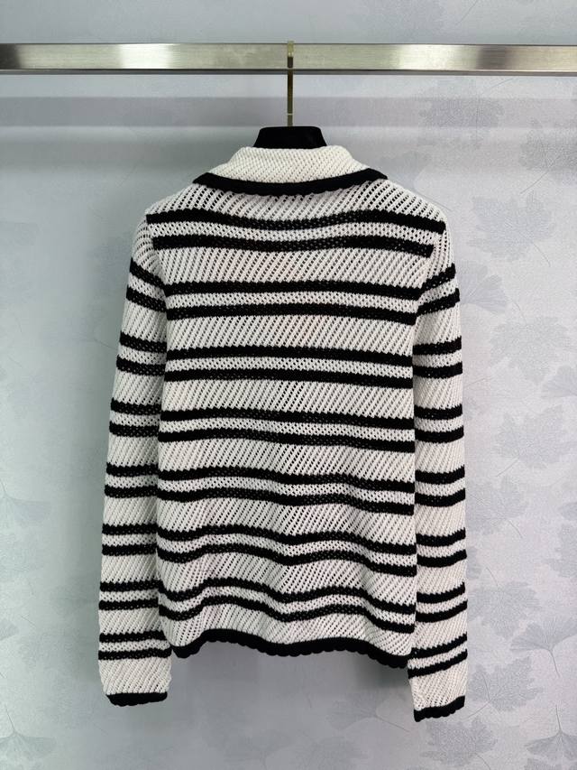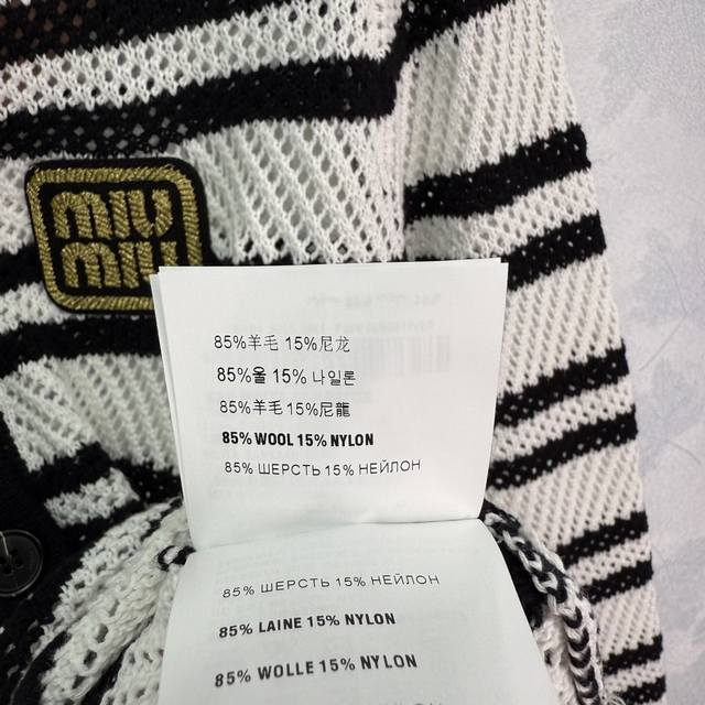 Miu*25 Early Fall new black and white striped knitted cardigan. Classic logo embroidery embellishment lapel design with black hem and hollow pattern. Simple and elegant. Pairs well with skirts or pants! 1 color, 3 sizes Sml