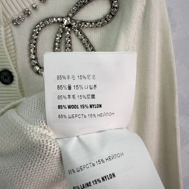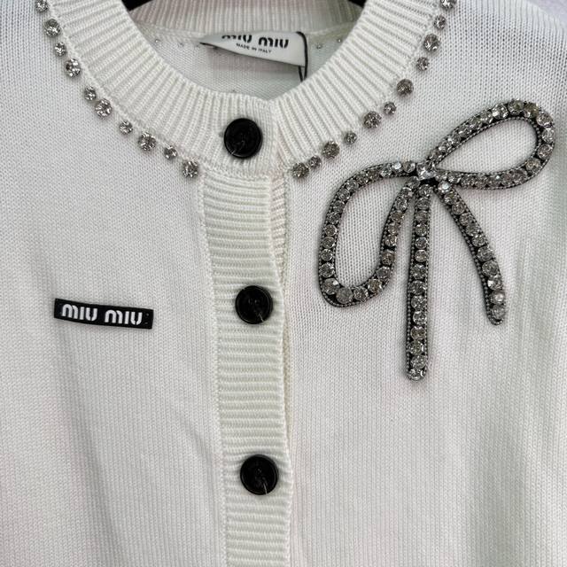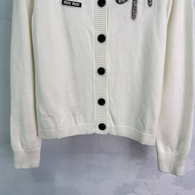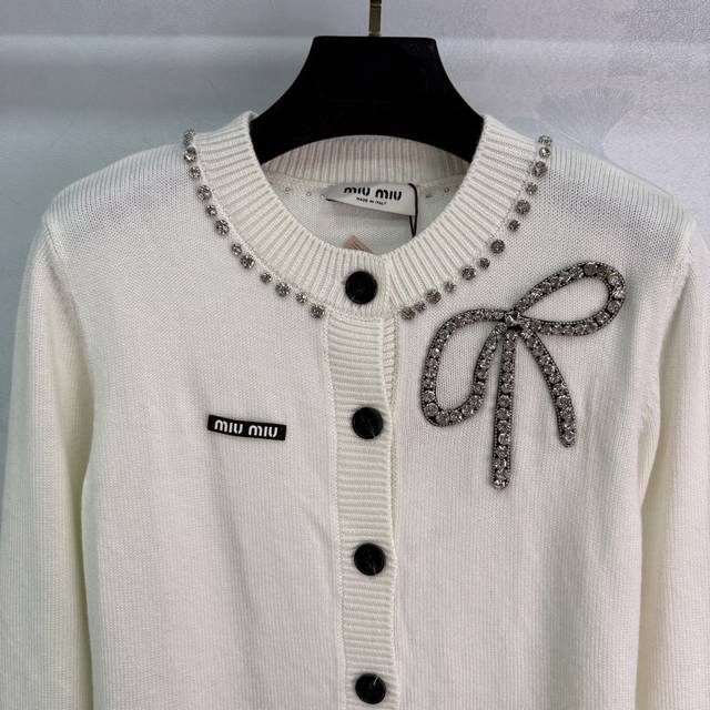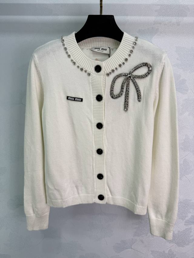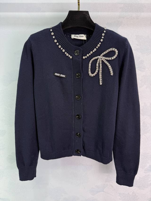 Miu*25 Early Fall new bow-knit cardigan. Exquisite hand-beaded bow design with black buttons. Round neck cardigan style. Wool blend fabric is soft and comfortable, knitted with exquisite craftsmanship. Slimming fit. Versatile in spring and fall, wear alone or layered in all seasons. Available in 3 colors and sizes (Sml T226B.