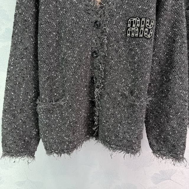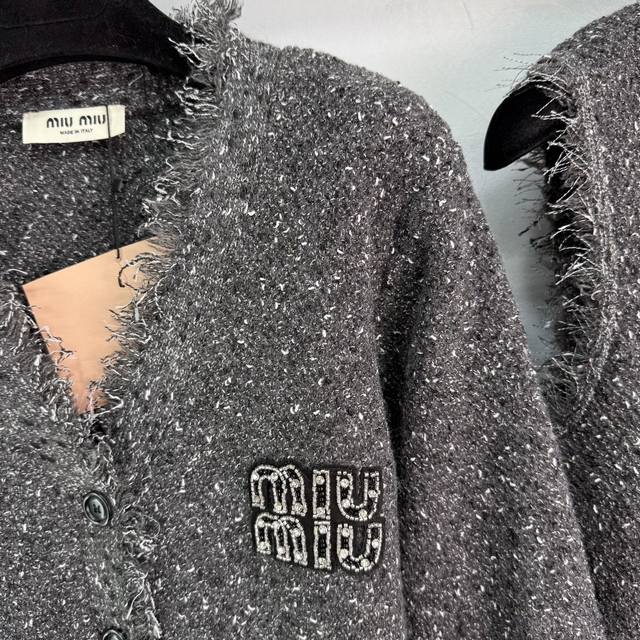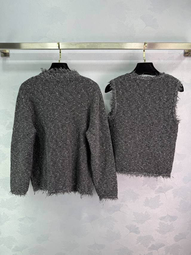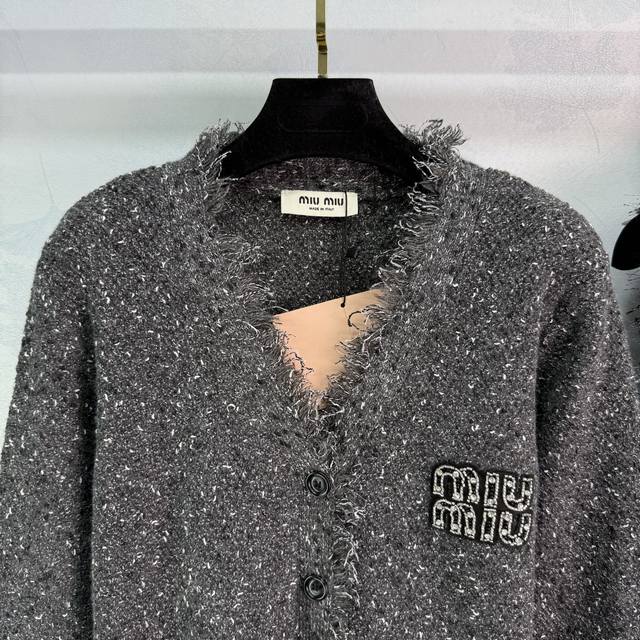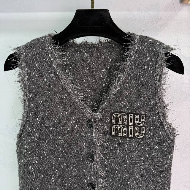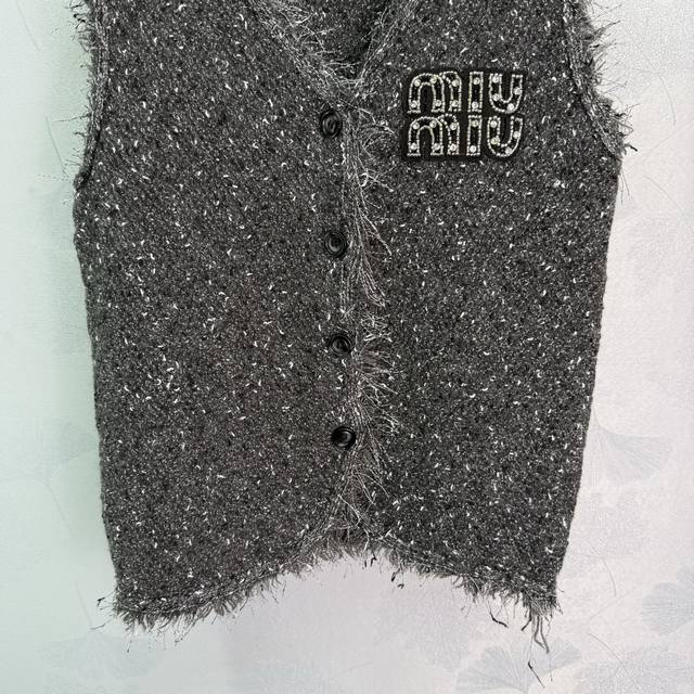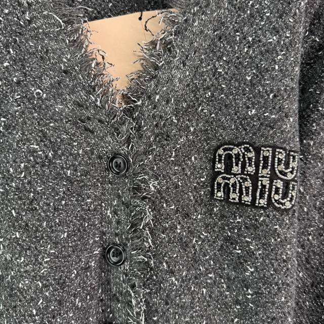 Miu*25 Early Fall new fringed cardigan and vest two-piece set. Soft and comfortable wool blend. Fringe trims for a stylish look. A chest logo highlights the enduring brand identity. Regular fit accommodates all body types. Stylish on its own, layered, and a must-have for everyday style! Available in 2 colors and 3 sizes. Sml T226B.