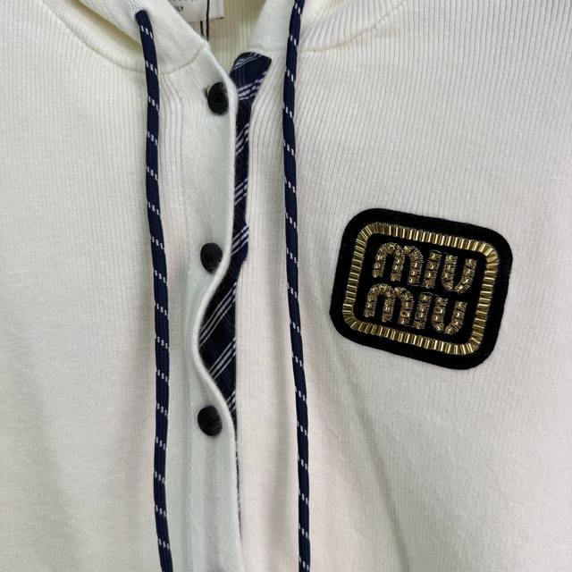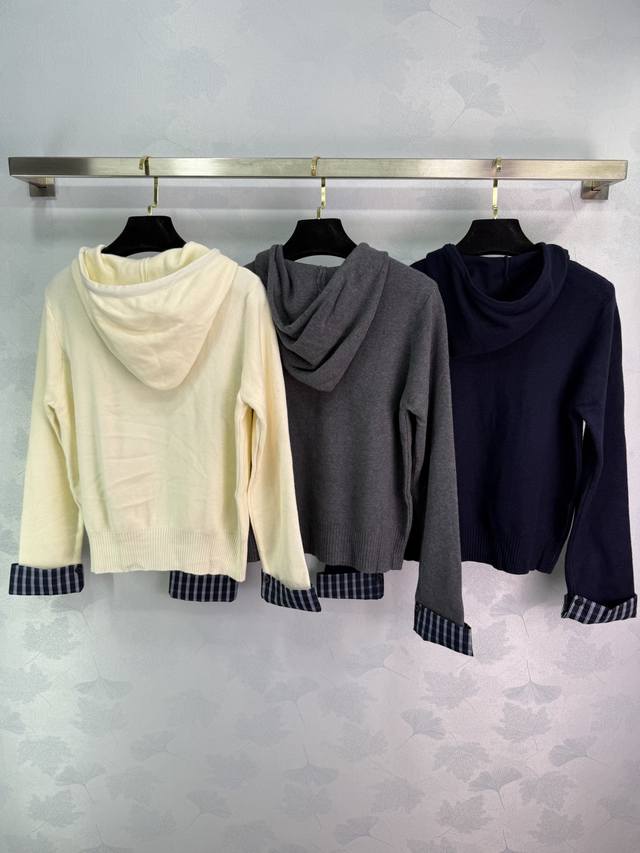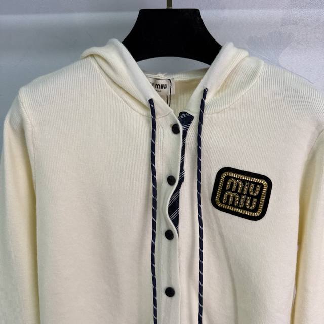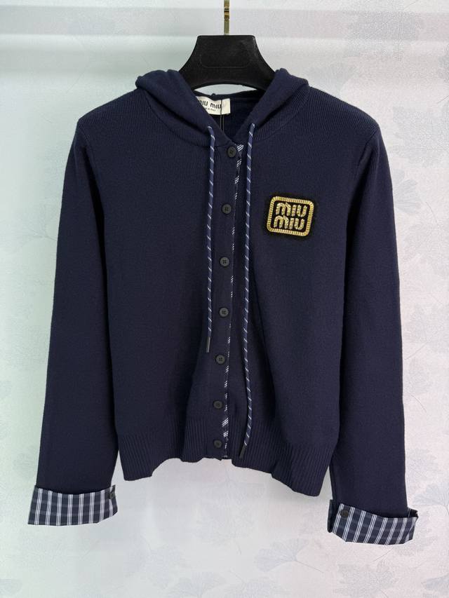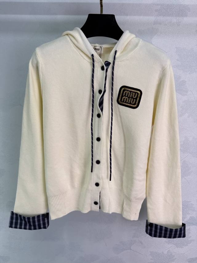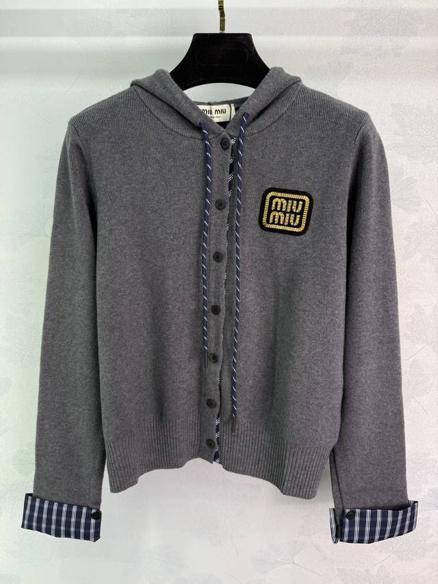 Miu*25 Early Fall new hooded knitted cardigan featuring classic logo embroidery on the chest. Plaid lining and single-breasted button fastening and plaid cuffs. Soft, comfortable, minimalist, and versatile. A versatile and stylish everyday style for fall and winter! Available in 3 colors and 3 sizes. Sml T226B.