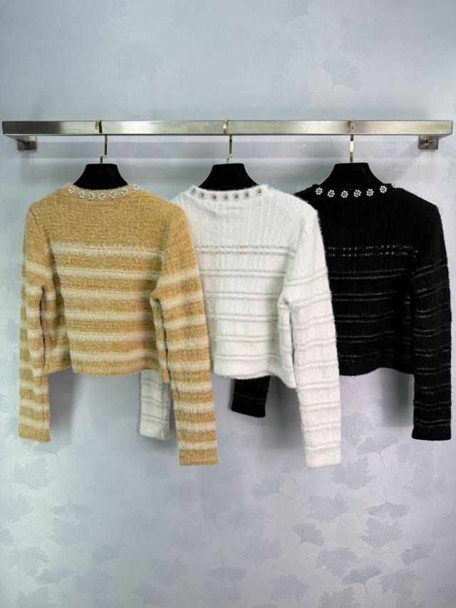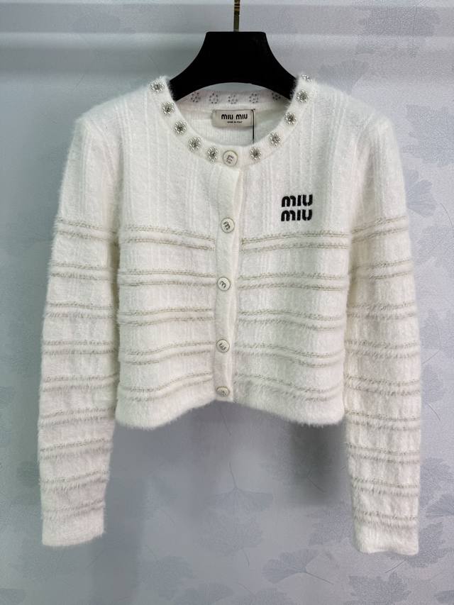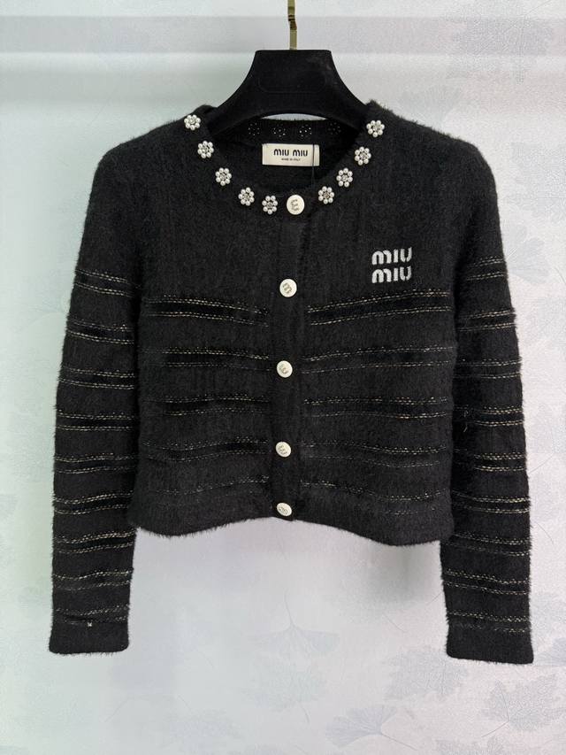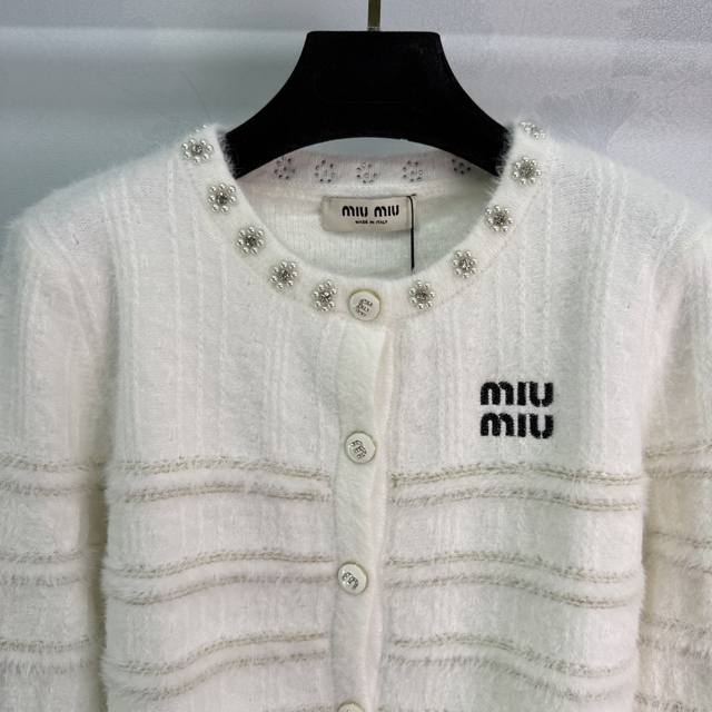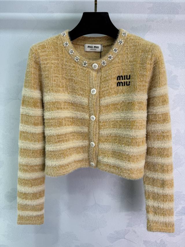 Miu*25 Early Fall new pearl-collar knitted cardigan. Classic striped design with logo embroidery on the chest. Made from a premium wool blend, this soft and comfortable knitted cardigan features a refined round neckline and long sleeves for a slim fit. The pearl-embellished neckline is stylish and stylish, perfect with skirts or pants! Available in 3 colors and 3 sizes. Sml T226B.