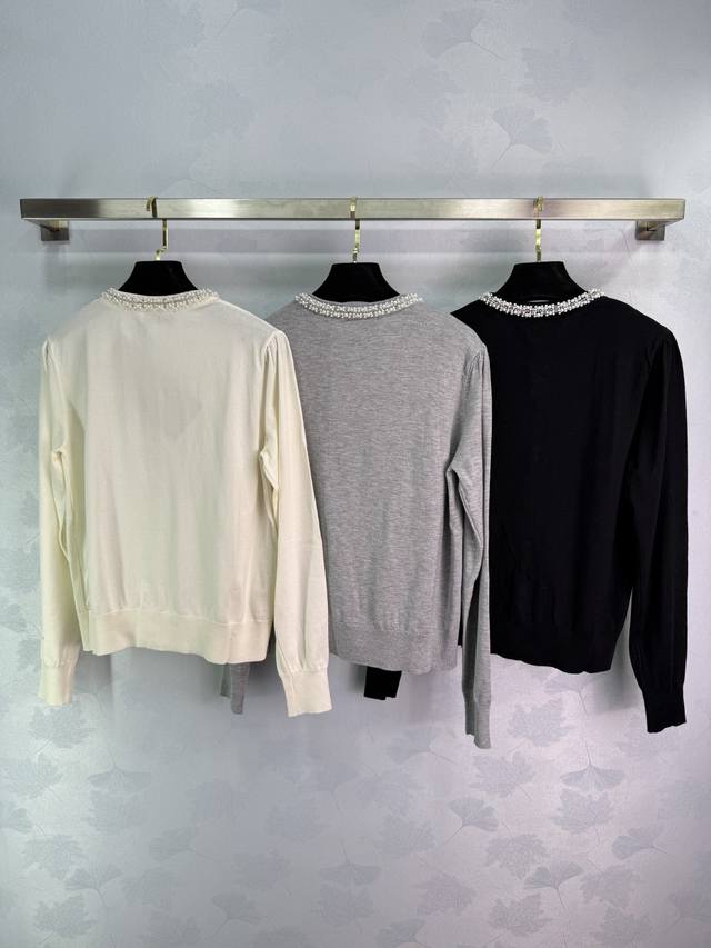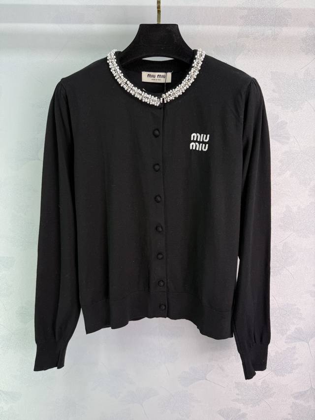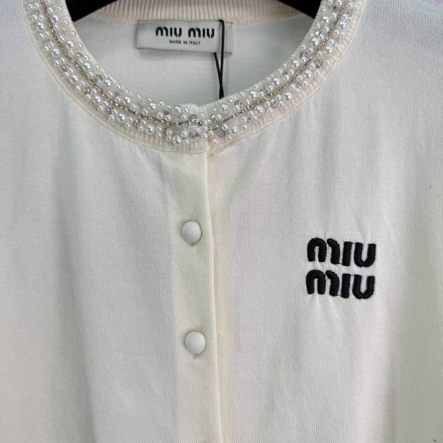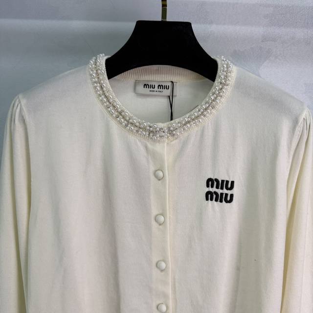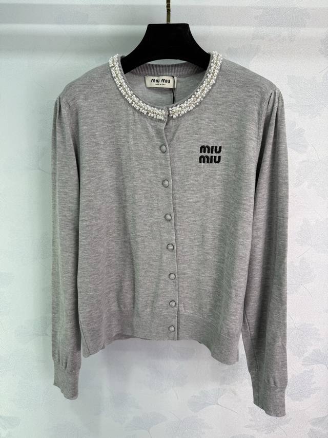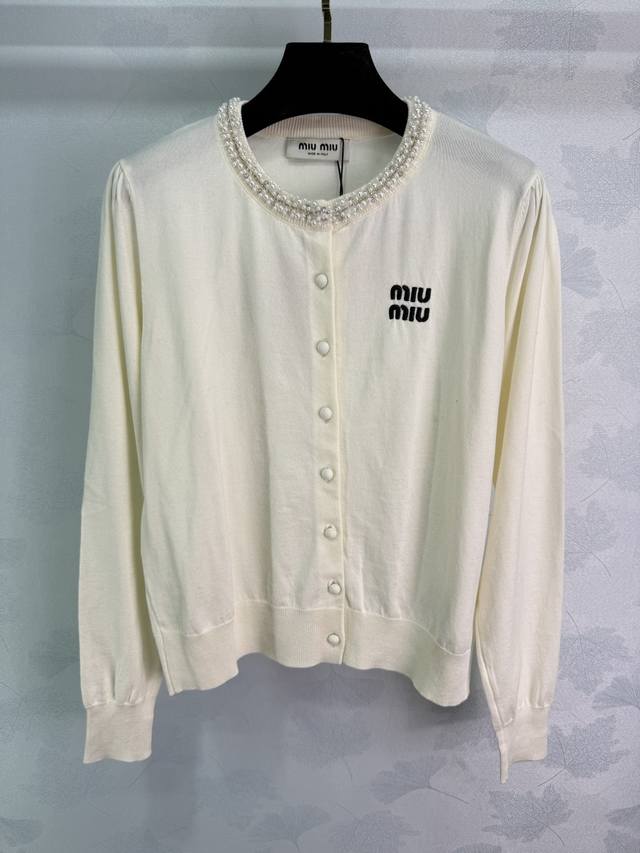 Miu*25 Early Fall new pearl-collar knitted cardigan, round neck design, button-front design, exquisite pearl embellishment on the collar, classic logo embroidery on the chest, highlighting the taste, playfulness, and youthful appearance. Easy to wear for daily travel or gatherings! 3 colors, 3 sizes Sml T226B.