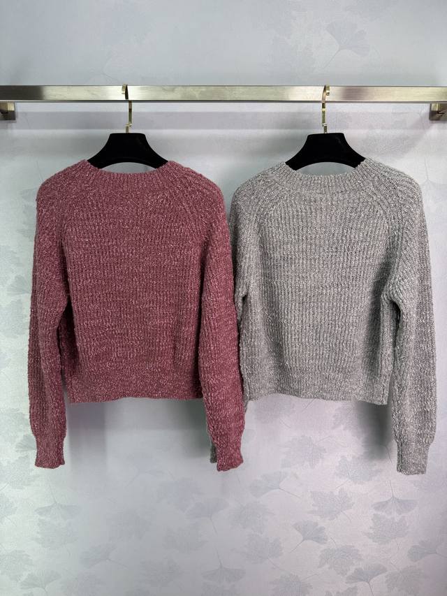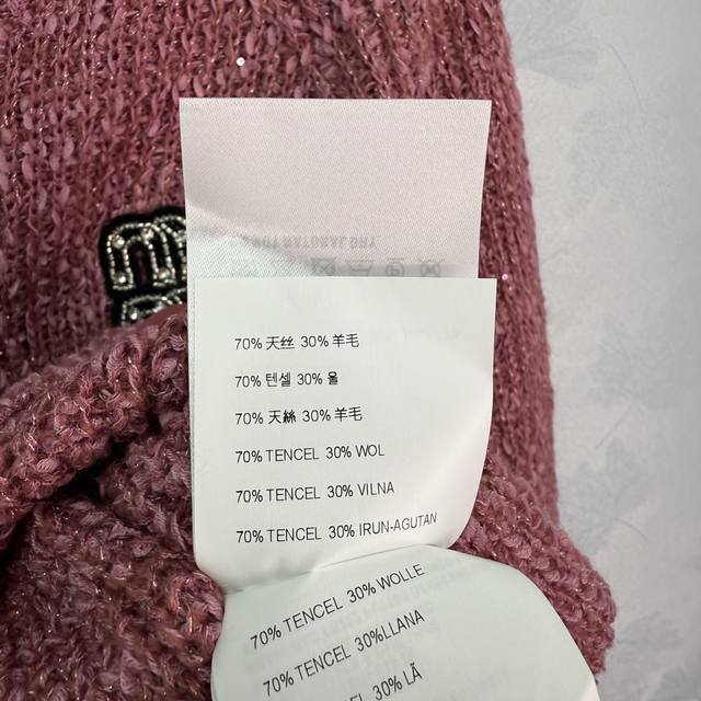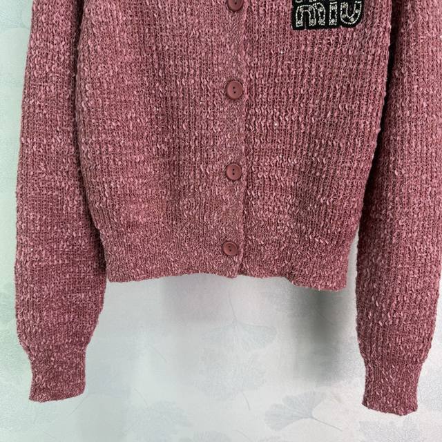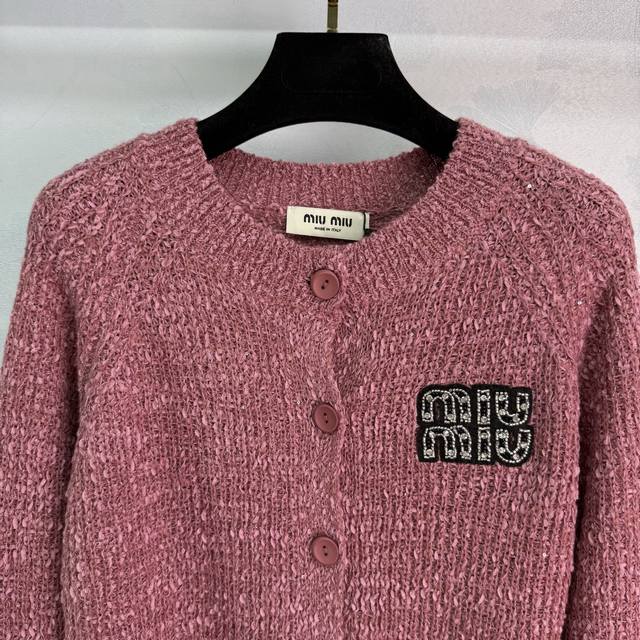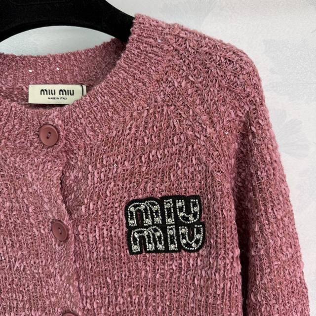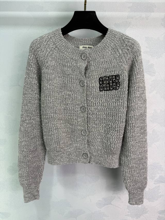 Miu*25 Early Fall new round-neck knitted cardigan featuring black logo embroidery and rhinestone trim on the chest. Wool blend fabric is soft and comfortable. Round neckline and single-breasted design make it an elegant and stylish choice! Available in 2 colors and 3 sizes (Sml
