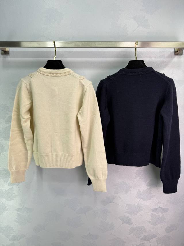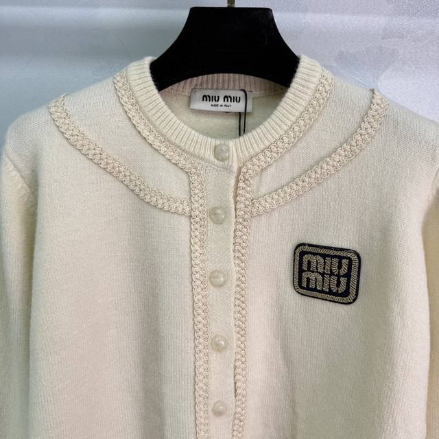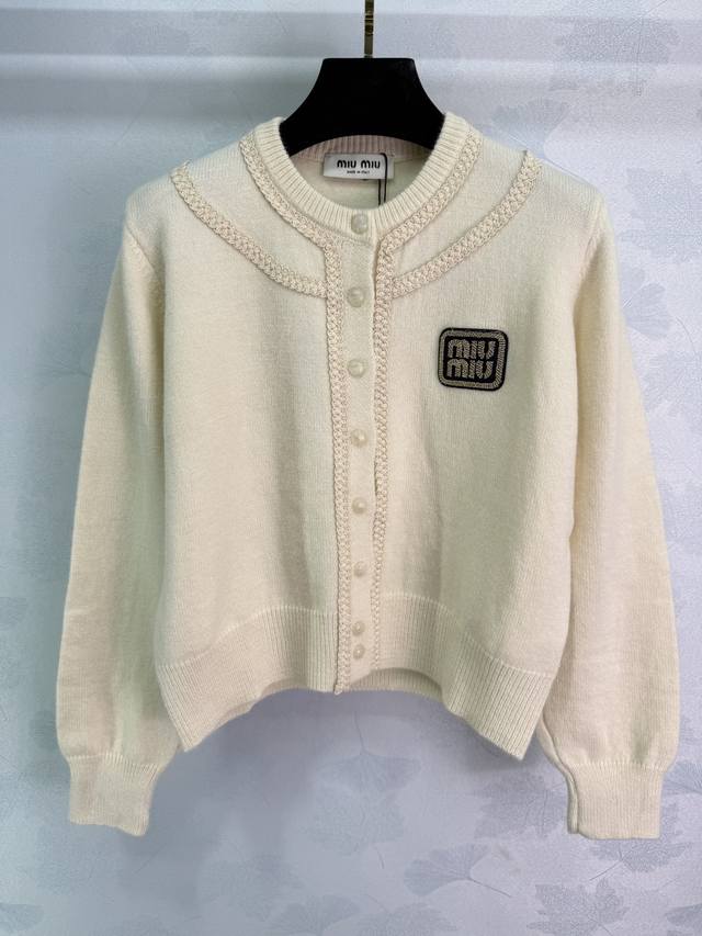 Miu*25 Early Fall new round-neck knitted cardigan with gold logo embroidery on the chest. Cable-knit textured design. Comfortable fabric, exquisite workmanship, and perfect details. Stylish and slimming. Perfect for everyday travel or gatherings! 2 colors, 3 sizes. Sml T226B.