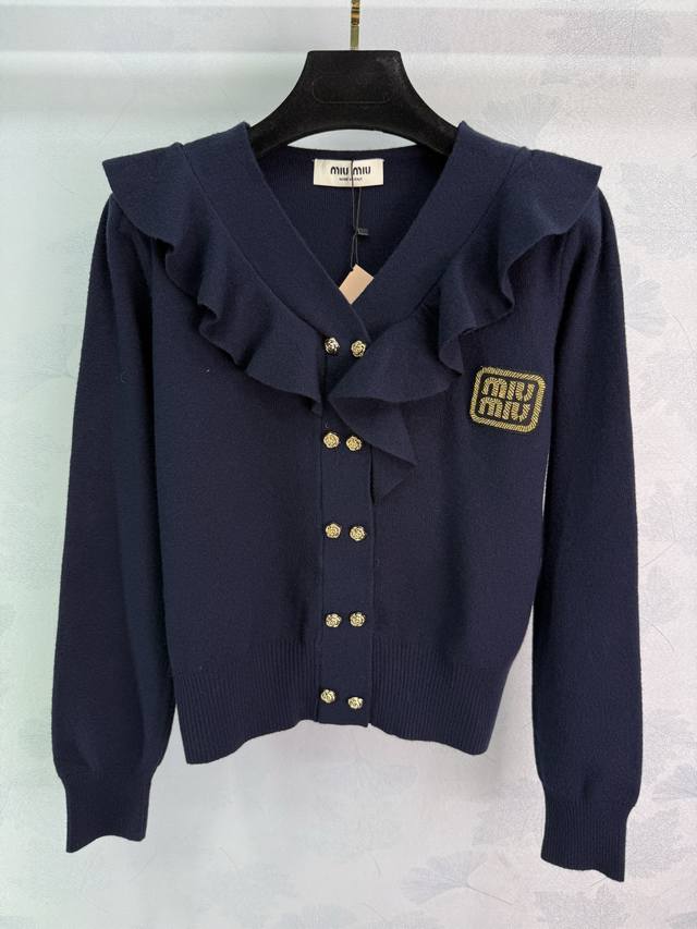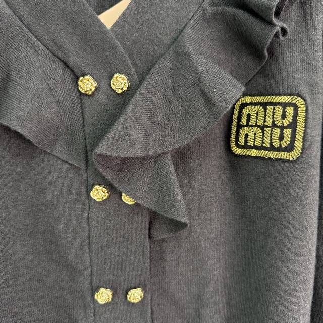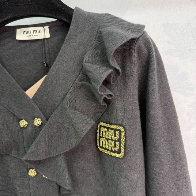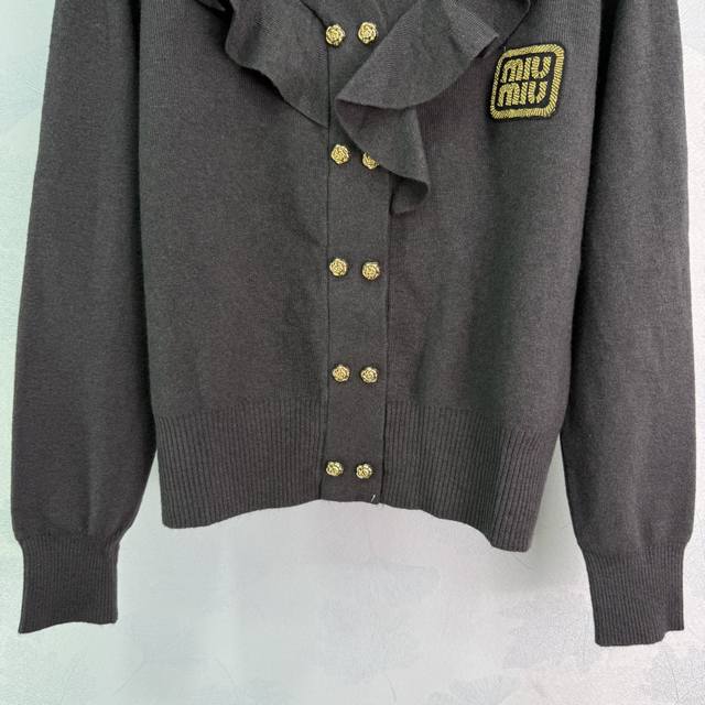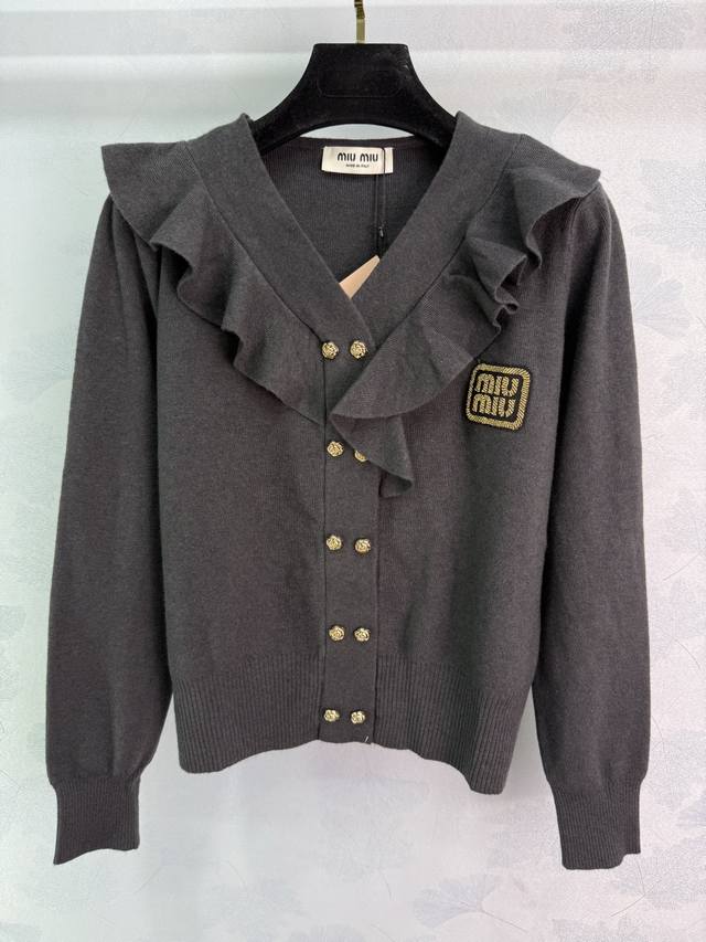 Miu*25 new autumn and winter V-neck knitted cardigan with ruffled design and gold buttons. Exquisite and elegant. High-quality wool blend fabric is soft and comfortable. The knitting craftsmanship is exquisite. The V-neck is slim and slimming. It looks great with skirts and pants! 2 colors and 3 sizes Sml T226B