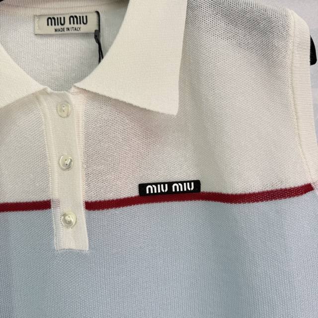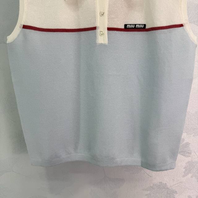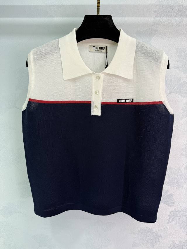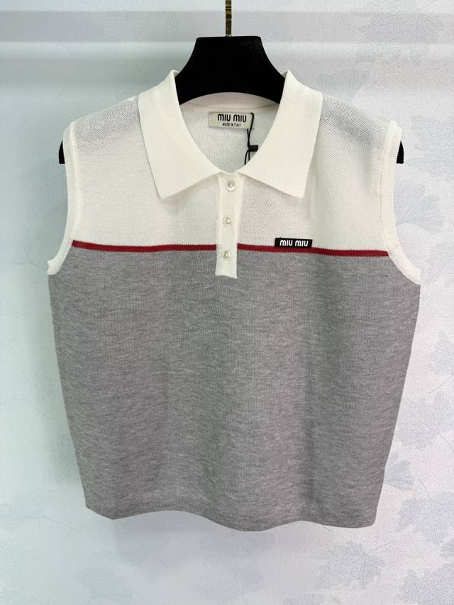 Miu*25 Spring and summer new style knitted sleeveless lapel top with contrasting color design, very beautiful neckline lapel style, exquisite workmanship, comfortable and breathable fabric, accommodating body shape, fashionable and casual wear! 3 colors and 3 sizes Sml T226B