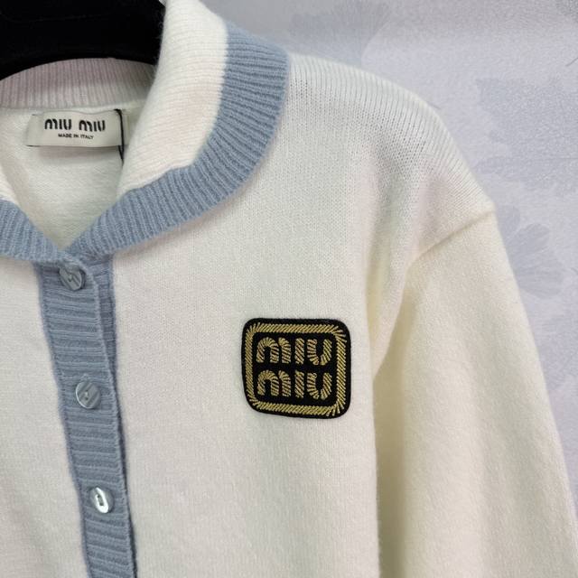 Miu*25's new early fall knitted cardigan features a light blue collar and gold l
