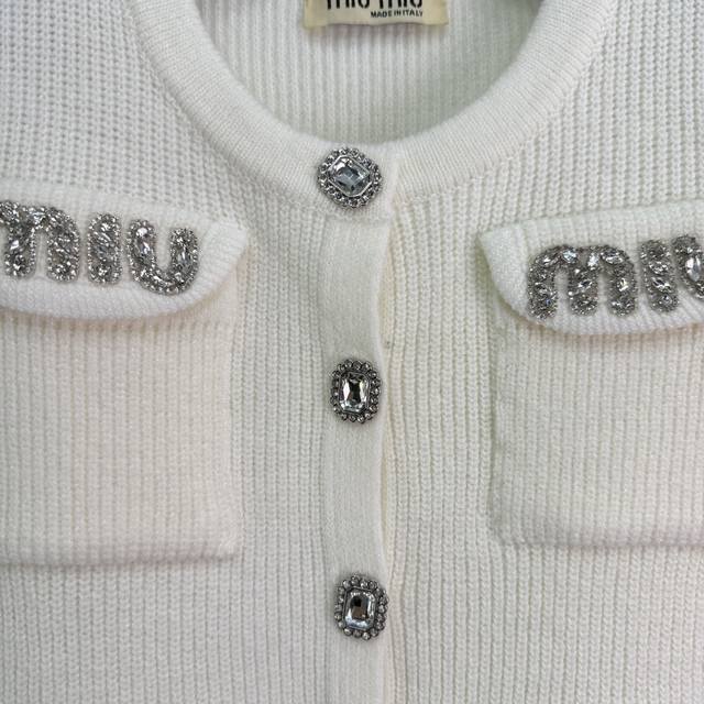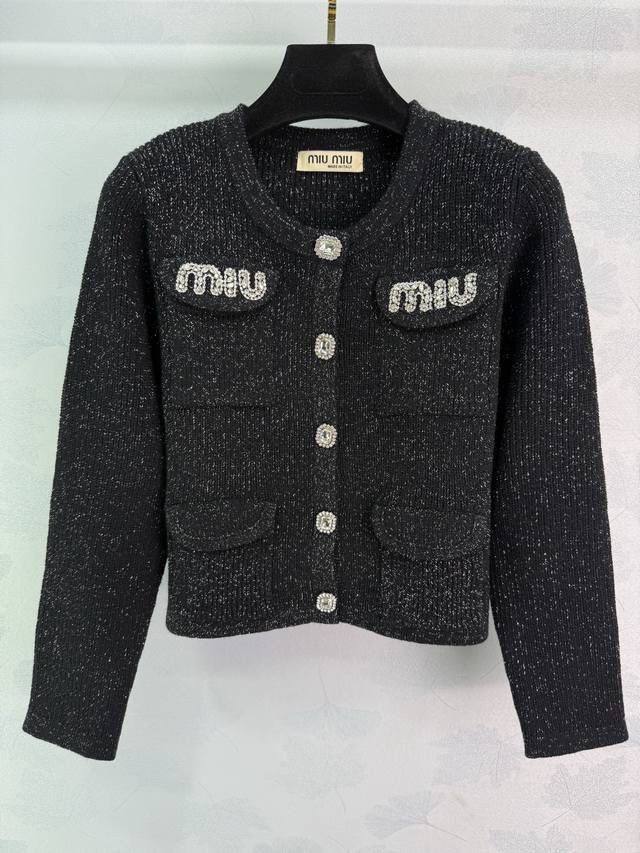 Miu*25's new early fall knitted cardigan features a rhinestone logo on the chest and gold button embellishments, showcasing the brand's signature style. The solid color scheme is meticulously crafted with subtle details, creating an elegant black and white look. It's effortlessly stylish and effortlessly chic with any outfit! Available in 2 colors and 3 sizes (Sml T226B