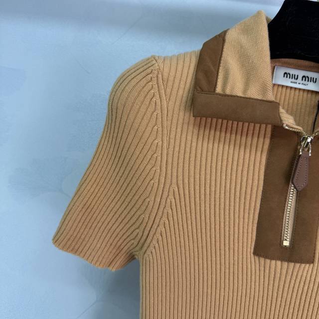 Miu*26 Early Spring New Color-Blocked Collared Knit Top, caramel brown knit + patchwork, full of retro sporty style, half-zip design + logo embroidery on the chest, exquisite details.