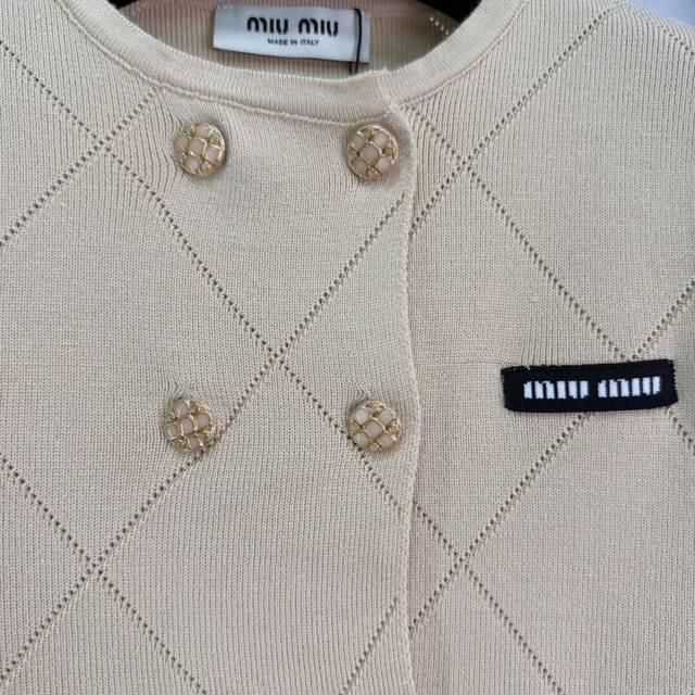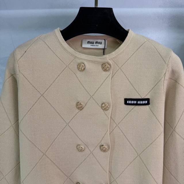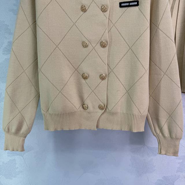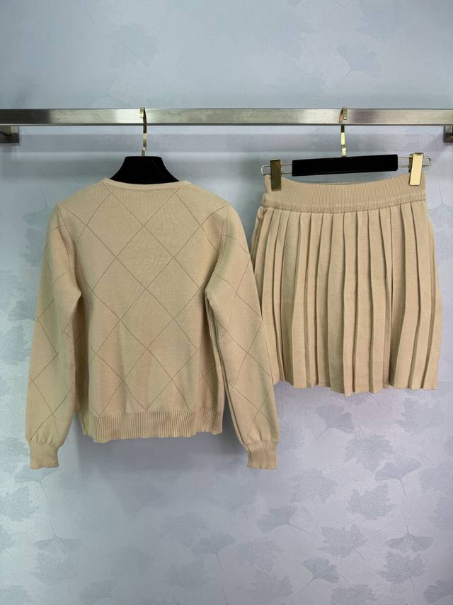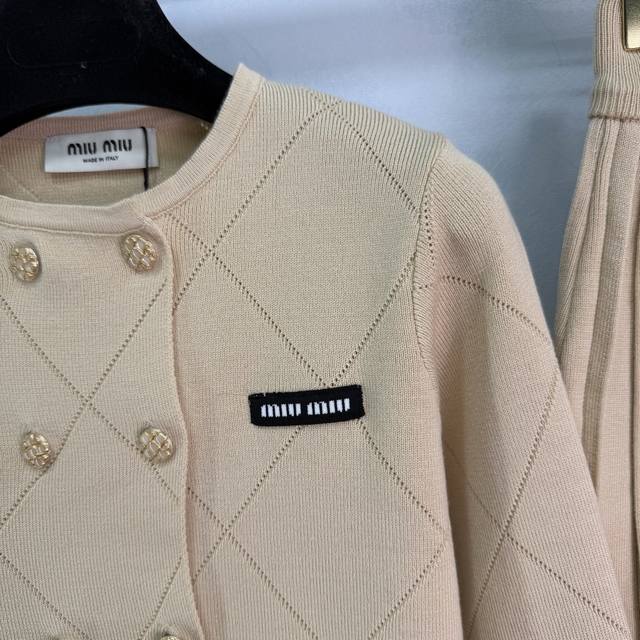 Miu*26 Early Spring New Geometric Knit Set Highly recognizable beige diamond pattern with gold buttons, both retro and fashionable. The black embroidered logo on the chest adds a touch of detail. The pleated skirt is made of the same material, blending a preppy style with a modern feel. Perfect for everyday wear, whether commuting or casual! 1 color, 3 sizes: S, M, L, T226B, DDD