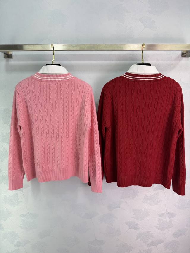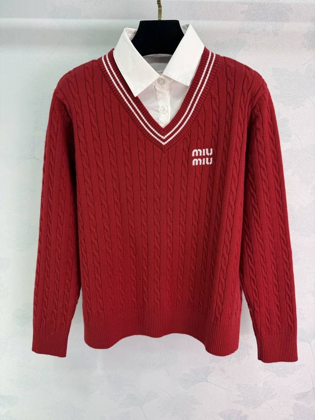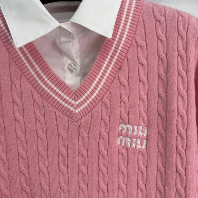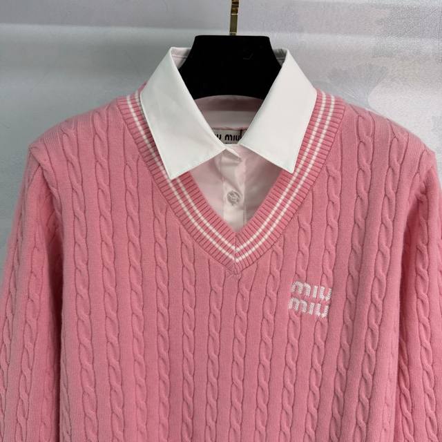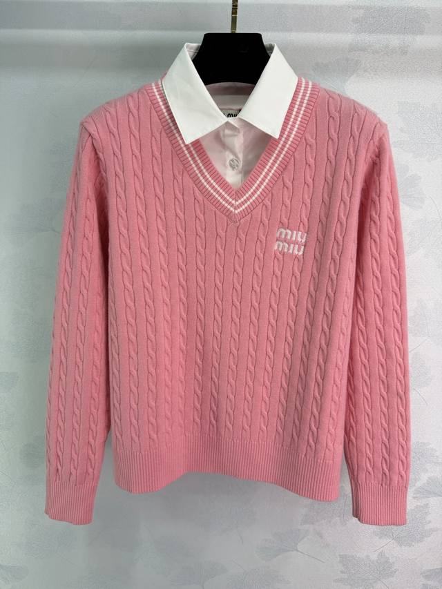 Miu*26 Early Spring New Style Faux Two-Piece Knit Cardigan with Embroidered Logo on the Chest. Features a white shirt collar and a cable knit texture design with delicate and rich layers, adding style to simple outfits. Regular fit to flatter the figure, slimming and chic! 2 colors, 3 sizes: S, M, L, T226B. DDD