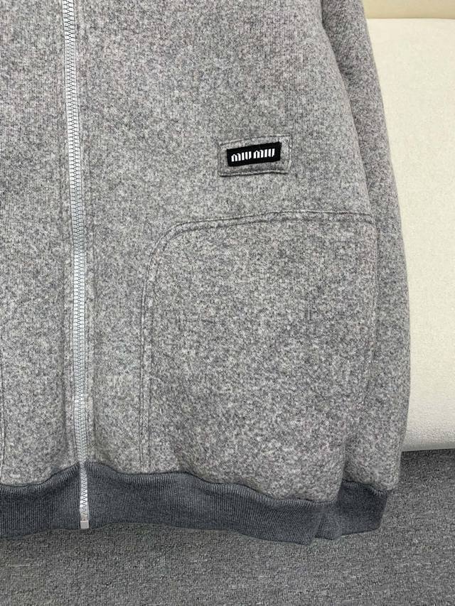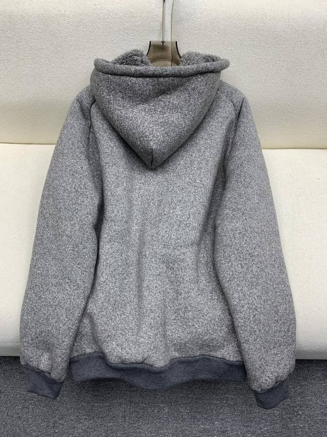 Miumi | 2025 Autumn/Winter New Micro-Label Thick Lambswool Hooded Jacket. The outer layer is made of a fine wool blend fabric, with a crisp texture and a luxurious matte finish; the inner layer is fully lined with soft lambswool, feeling like being wrapped in a cloud. The oversized brim of the hood combines style and practicality. On cold days, pull up the drawstring to instantly create a casual yet warm layered look! With its unisex design, this jacket redefines the sophistication and practicality of autumn/winter outfits!