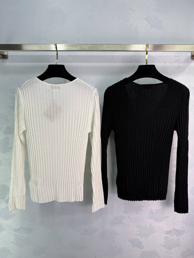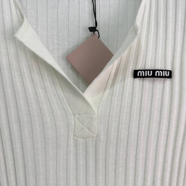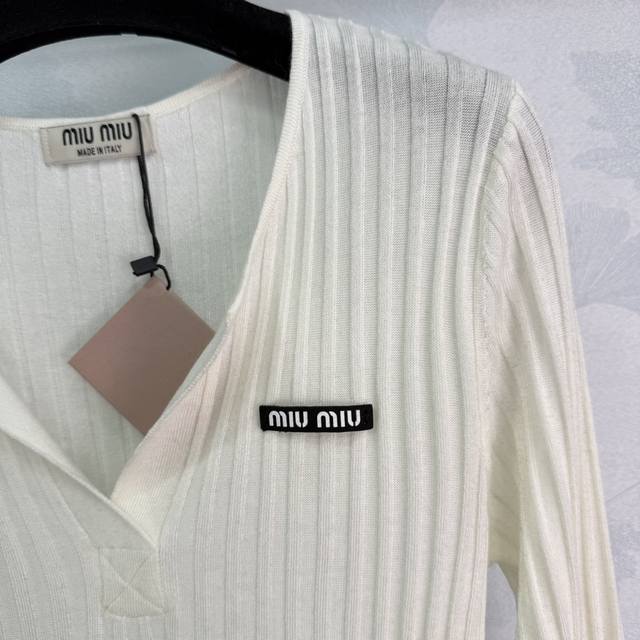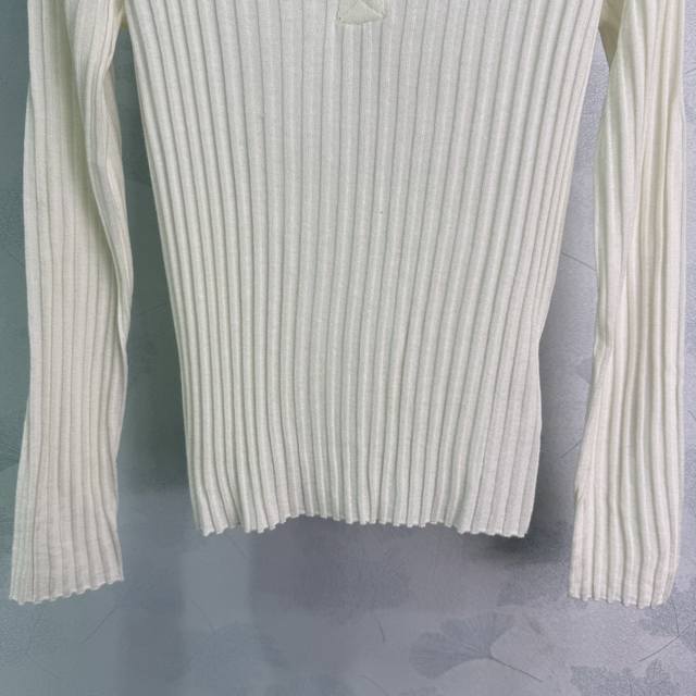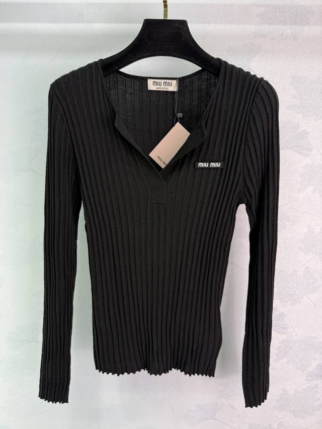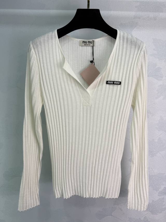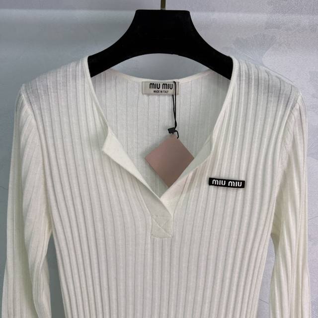 Miumi* 2025 Early Autumn New Half-Open Knit Long-Sleeve! Made with custom wool yarn, this soft and comfortable half-open knit long-sleeve top features a delicate texture and a round neck. The cut is refined with vertical ribbed stripes along the entire body. A single embroidered logo on one side showcases the brand's style. The slim fit flatters the figure, creating a youthful and flattering look. A versatile style! Available in 4 colors and 3 sizes: S, M, L, D, D.
