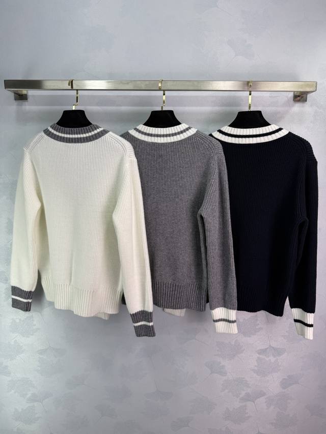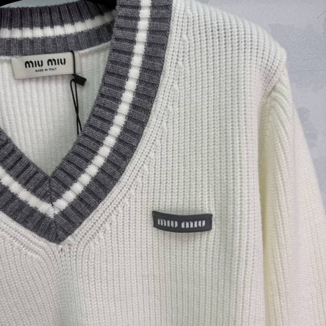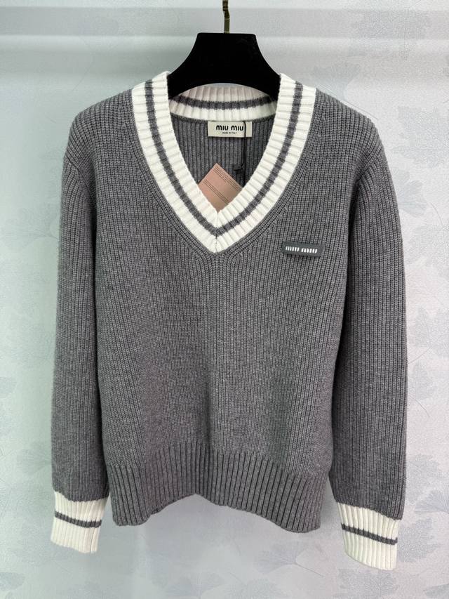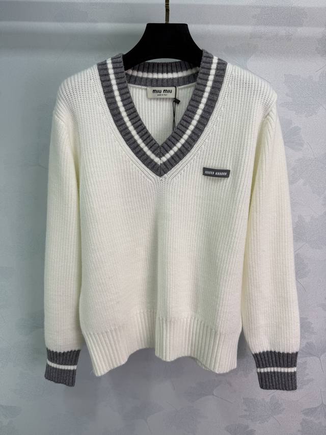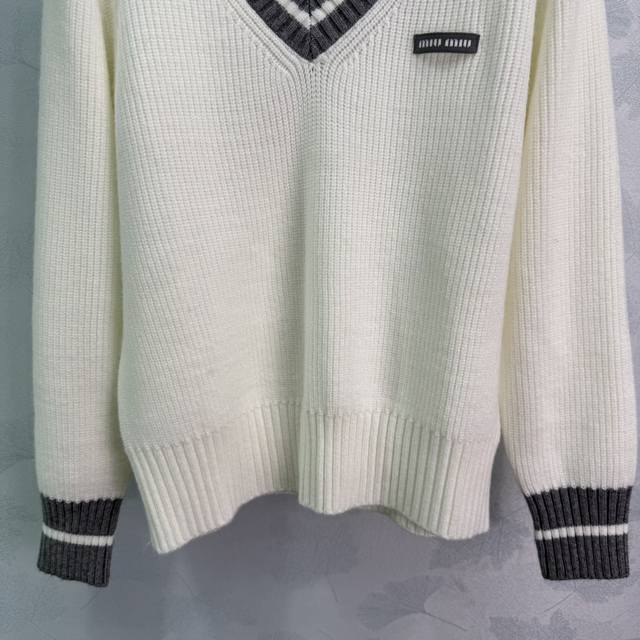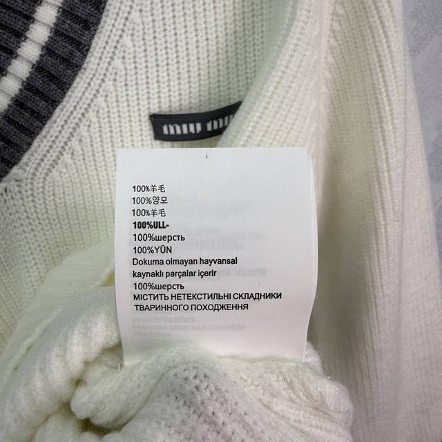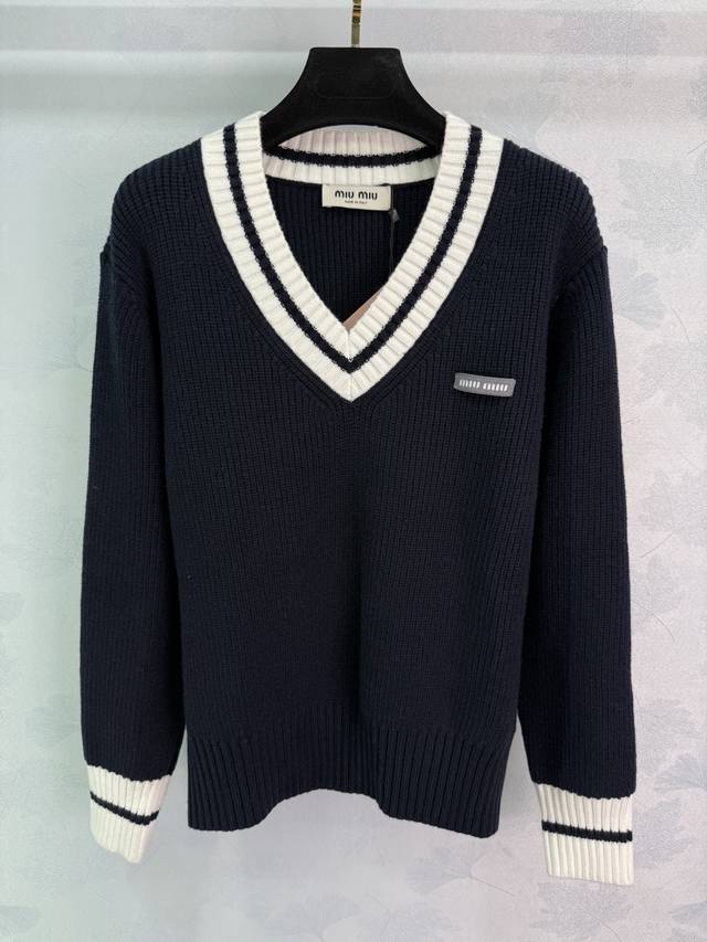 Miumi* 2025 Early Fall New Crochet Letter Pullover Sweater! Custom-woven wool yarn for a premium, comfortable, and soft pullover with long sleeves. The dense knit is windproof and warm, with vertical knit texture throughout. The all-over hems are highlighted with white stripes and contrasting hems. It exudes a youthful, collegiate vibe, and features a chest pocket with a crocheted letter logo, highlighting the brand's details and texture. This versatile, drop-shoulder, mid-length design accommodates any figure, creating a stylish and casual look! Available in 3 colors and 3 sizes. Sml T226B.