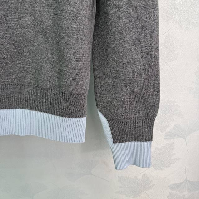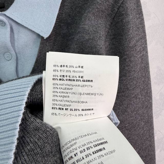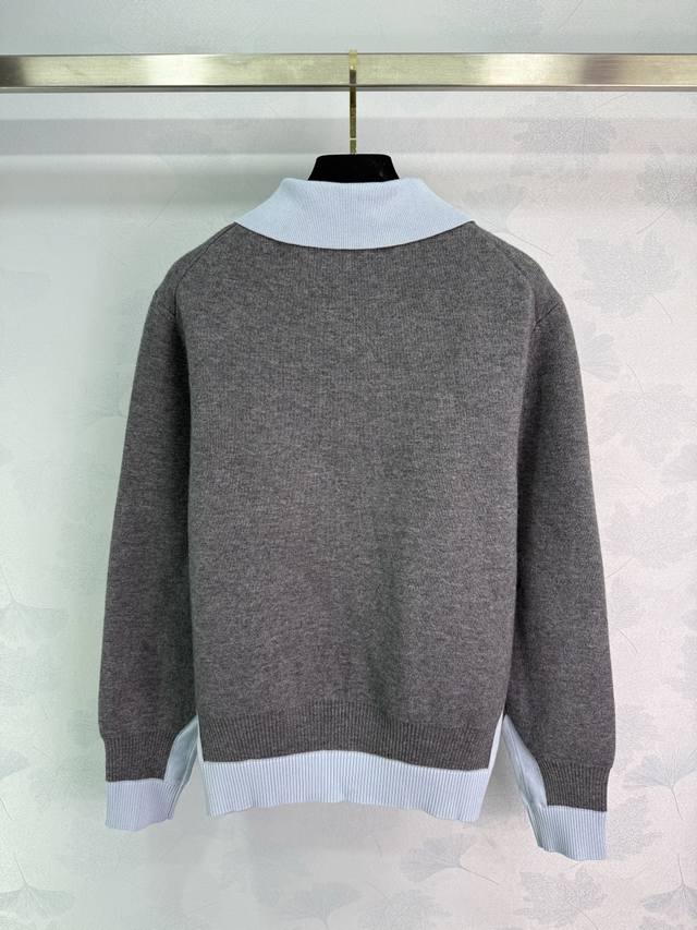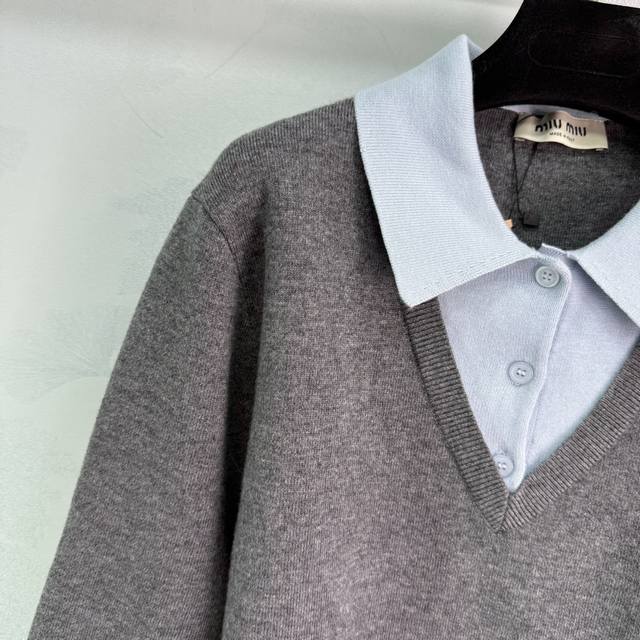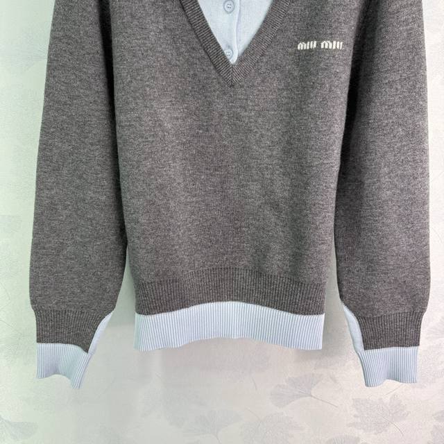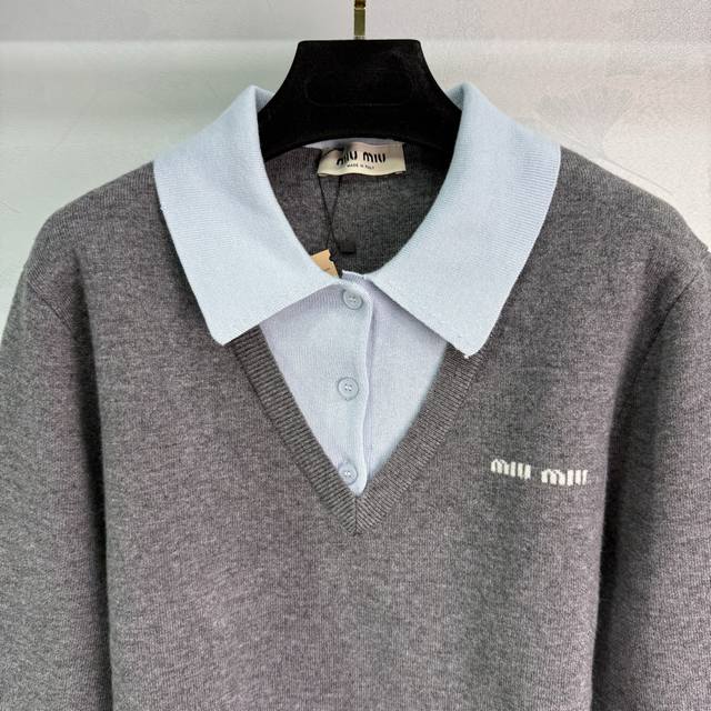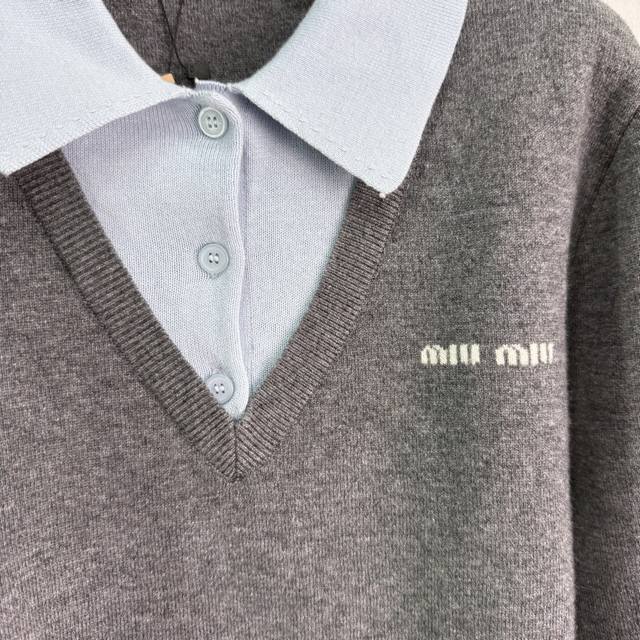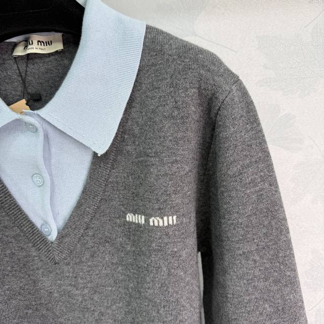 Miumi* 2025 Early Fall new faux two-piece knitted lapel top, custom-woven from YB cashmere yarn. High-quality, semi-open placket with buttoned hem and patchwork detailing creates a faux two-piece look, adding a playful, artistic, and tranquil vibe. A monogrammed logo accents the chest, elevating the brand's premium aesthetic. One color, three sizes. Sml T226B.