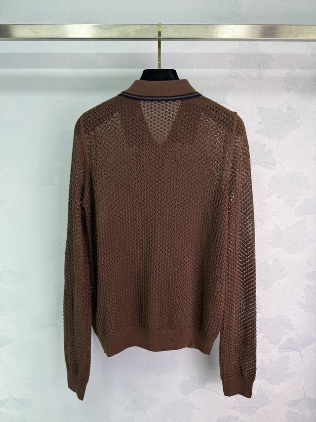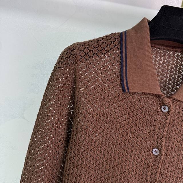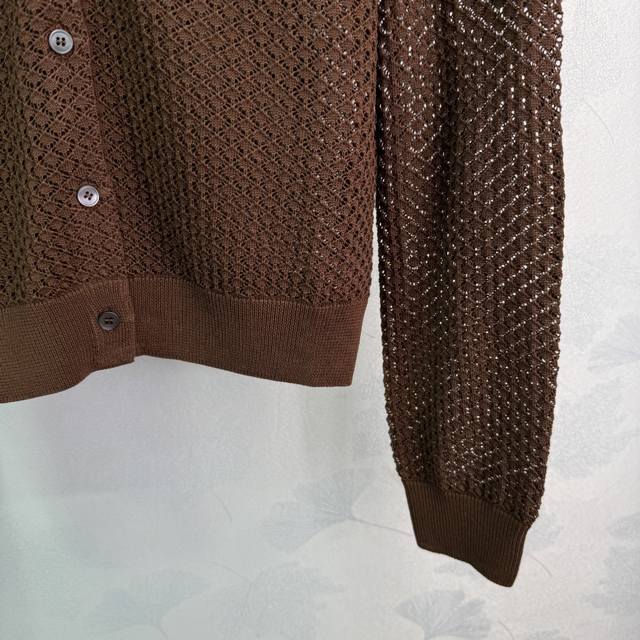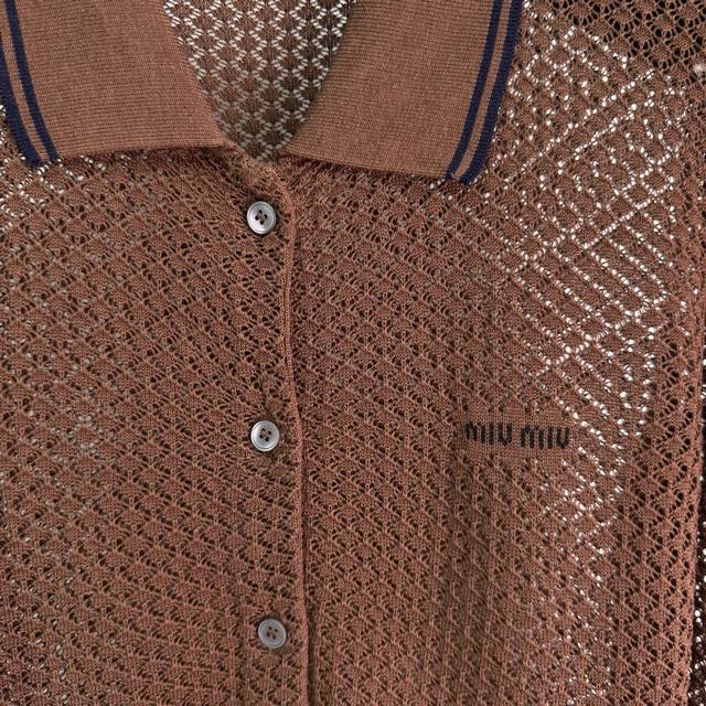 Miumi* 2025 Early Fall new hollow knit cardigan! Custom-woven silk and linen yarn for a premium, lustrous, and comfortable knitted lapel. The cardigan features a wavy diamond pattern interwoven throughout with hollow crochet stitches, highlighting the premium feel of the outfit. Stripes on the neckline outline the cuffs and hem, while threaded lace trims enhance the look. The elasticated fit enhances the slimming silhouette, creating a relaxed, accommodating silhouette. The contrasting embroidered logo on the chest accentuates the relaxed, effortlessly chic aesthetic. Perfect for both solo and layering, this stylish cardigan is the perfect choice for all seasons! 1 color, 3 sizes. Sml T226B.