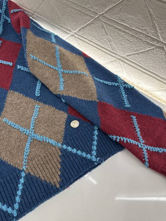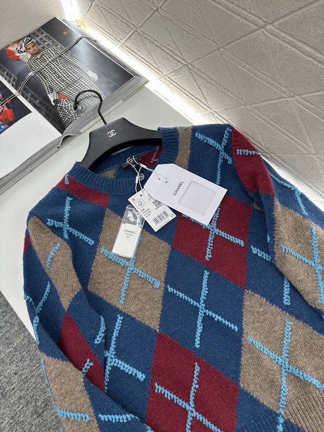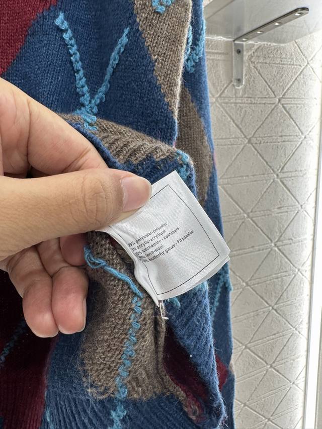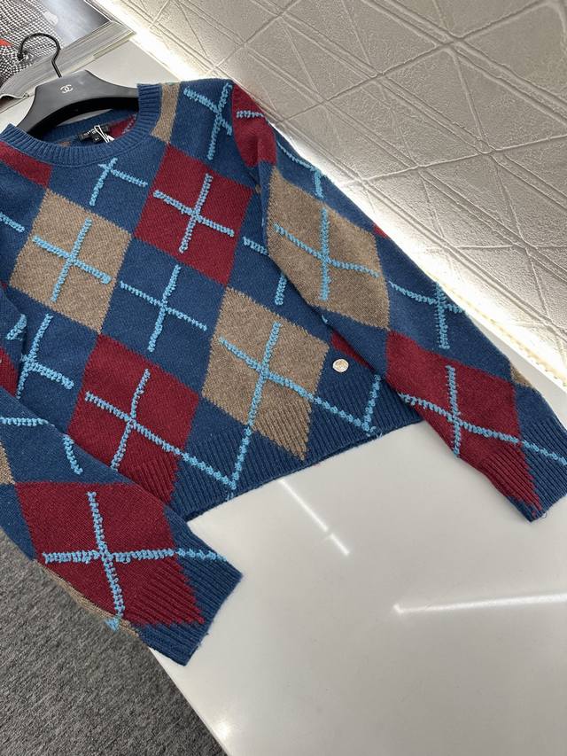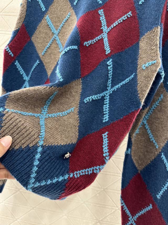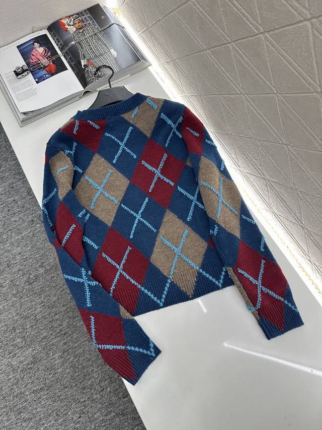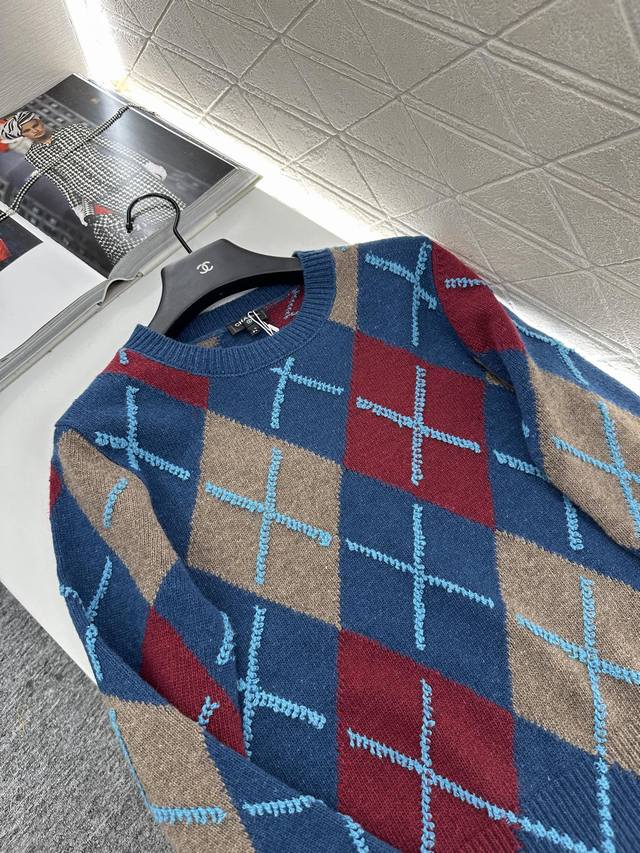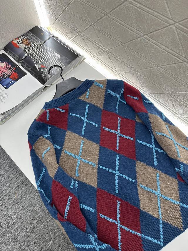 Custom Yb wool yarn, multiple washes, soft and comfortable crew neck long sleeve pullover sweater tailored collar and cuffs spiral hem full body three-color staggered diamond 3D crochet cross elements color pattern multiple collision loose and age-reducing hem engraved round buttons rich design layering adds a college youthful atmosphere Regular version suitable for all body types, a must-have for dating and commuting