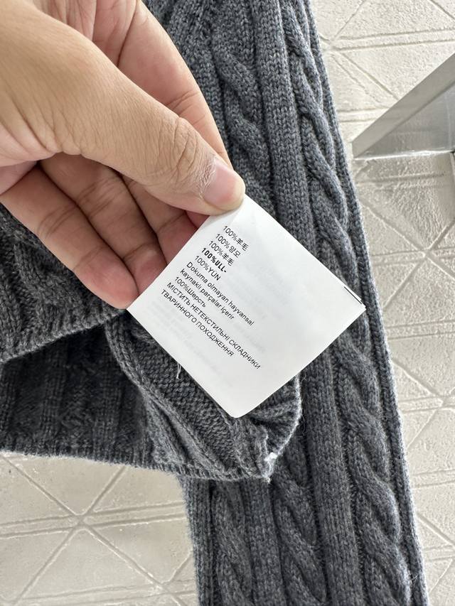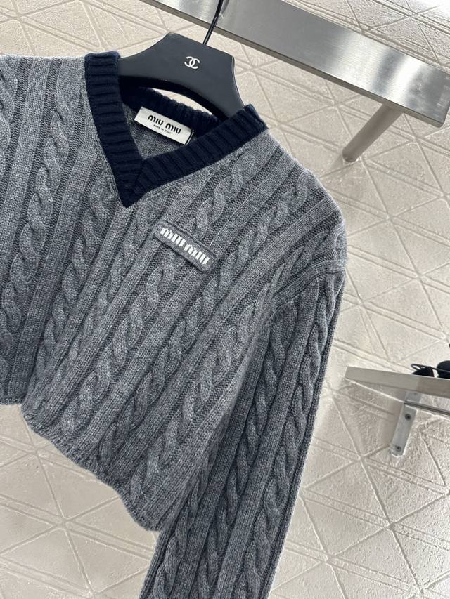 Custom Yb wool yarn weave for a premium, comfortable, and soft V-neck, cropped, knitted long-sleeved sweater with a black collar and contrasting threaded hem. Letter logo detail on the chest highlights the brand's signature style. Short, waist-revealing silhouette. Vertical cable-knit throughout. Durable, light gray accentuates style. A stylish, relaxed fit for fall and winter layering. Customized fabrics and accessories. Look for the high-end