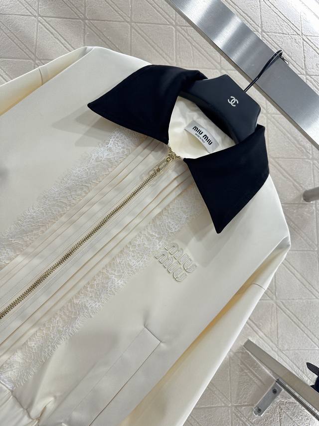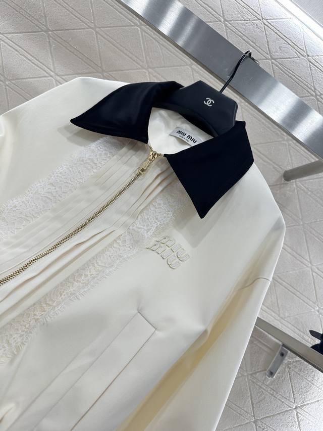 Contrast Lace Lapel Jacket. Made from custom Yb twill cotton, this jacket features a refined texture and a premium lapel zipper. The straight shoulder design accentuates the figure, complementing the body with a bold off-white and black collar. The contrasting colors create a stylish and eye-catching look. The front zipper is accentuated by symmetrical, water-soluble lace trims, creating a rich, layered look. The exquisite, enduring details of the chest logo highlight the brand's style, creating a sweet, youthful look. Fashionable and stylish, this jacket features custom fabrics and accessories. Look for the high-end