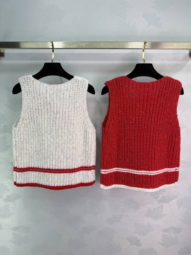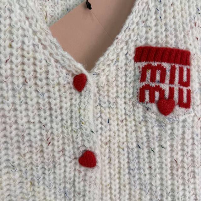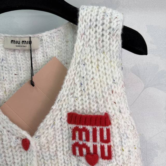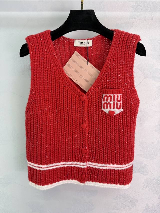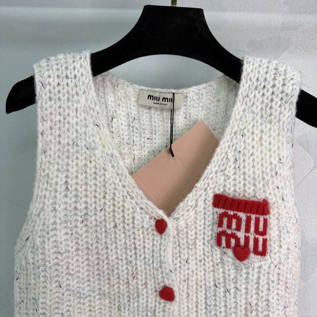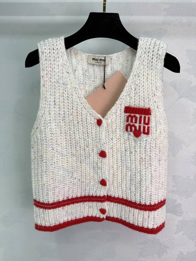 Miumi* 2026 Early Spring New Color-Blocked V-Neck Knitted Vest! Made with custom wool blend yarn, featuring a clear, textured ribbed weave. Custom heart-shaped buttons and crochet lettering on the chest pocket add depth and dimension to the design. Effortlessly chic and relaxed! Available in 2 colors and 3 sizes: S, M, L, T226B. DDD