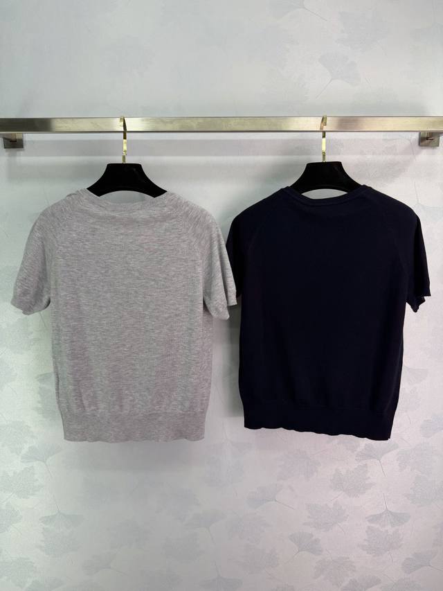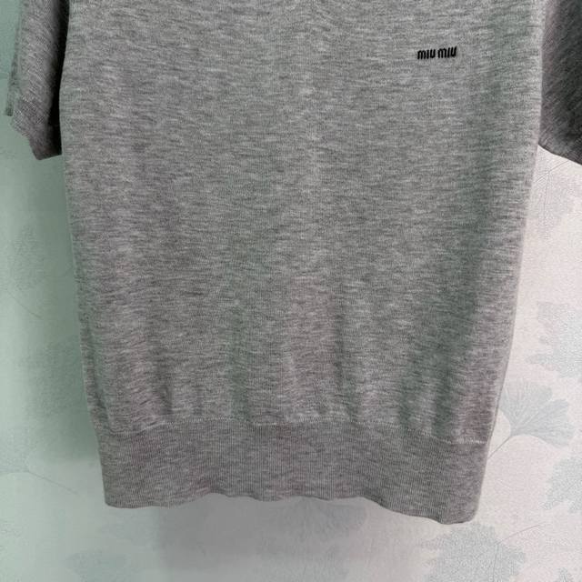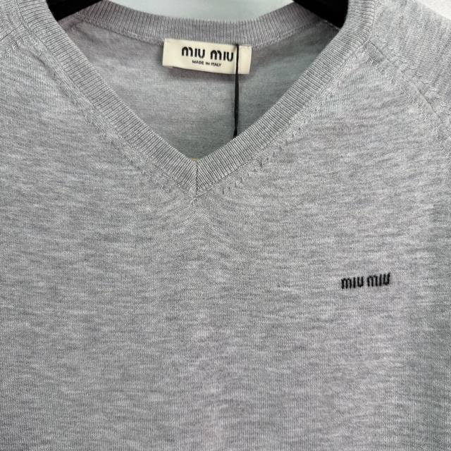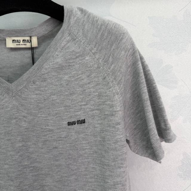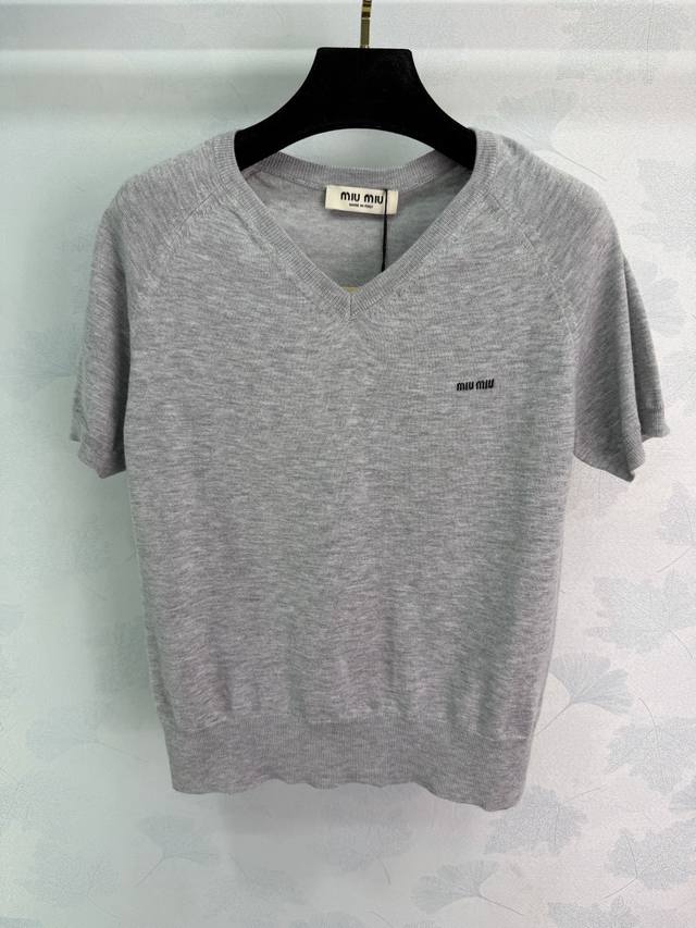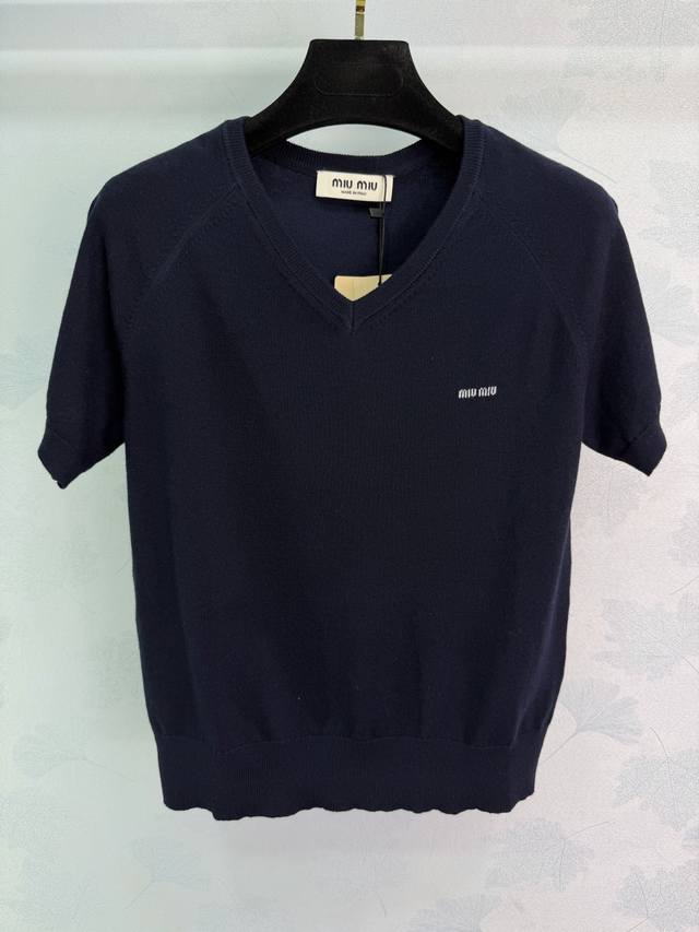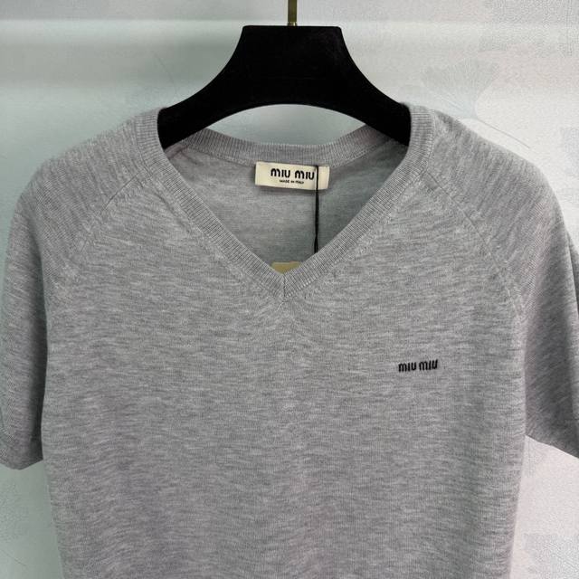 Miumi* 2026 Early Spring New Knitted Short-Sleeve Top! Crafted from custom wool yarn, soft and comfortable with a superior texture. Features a V-neck sweetheart neckline and a ribbed knit trim at the hem and cuffs. A letter logo on the chest adds a touch of style. The slim fit is flattering and perfect for a retro-chic look! Available in 2 colors and 3 sizes: S, M, L, T226B, DDD