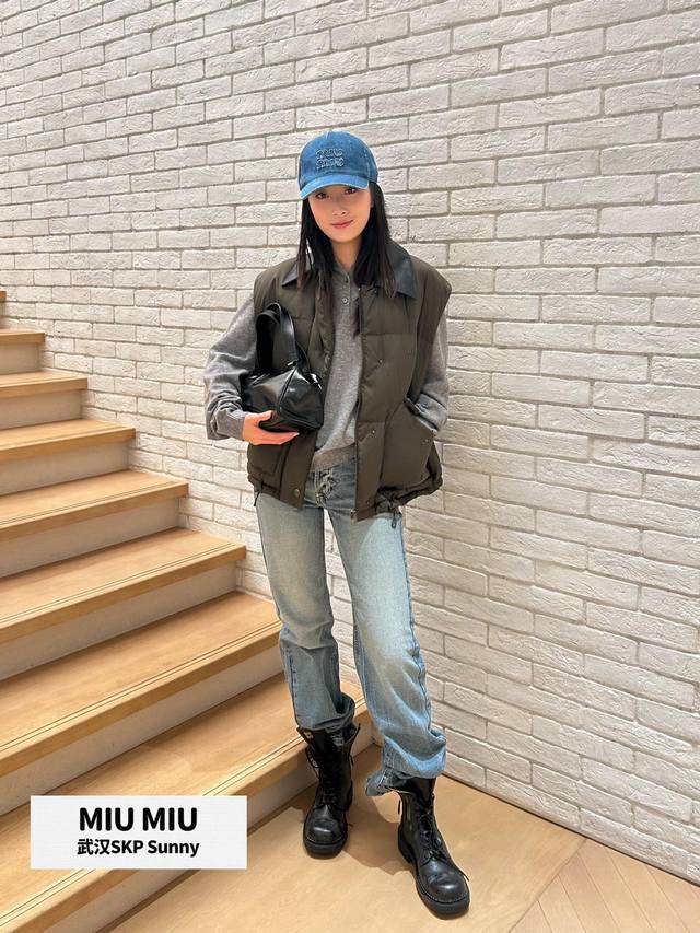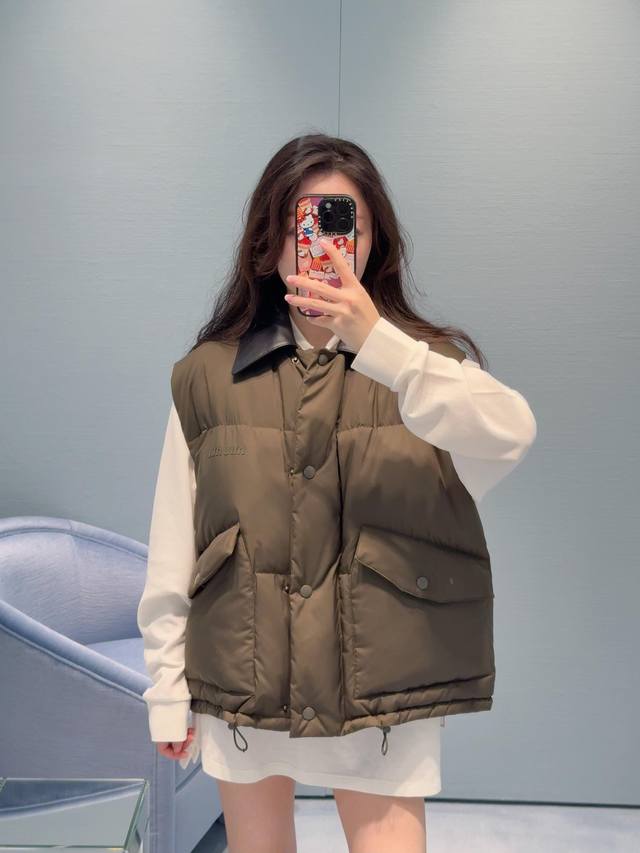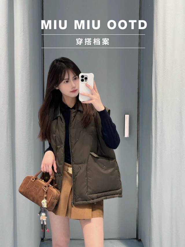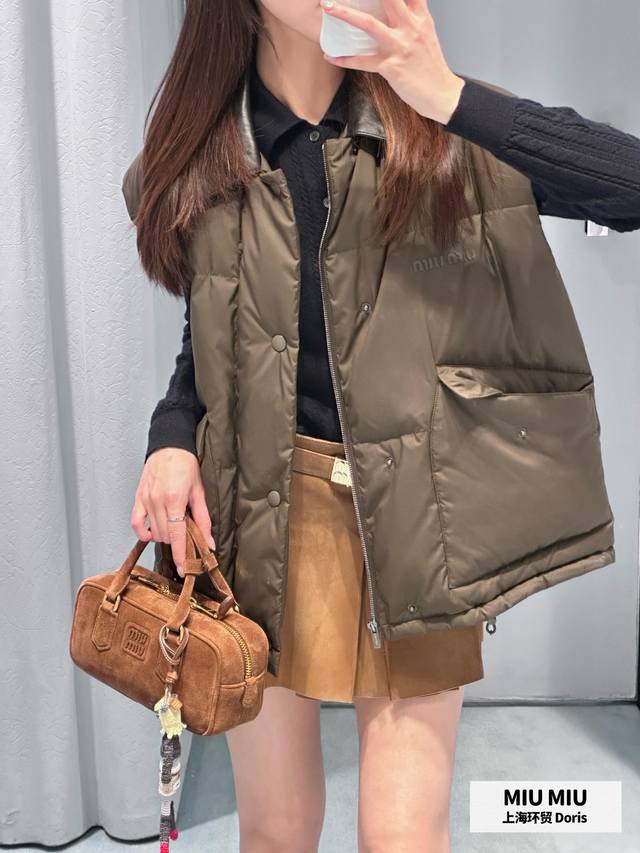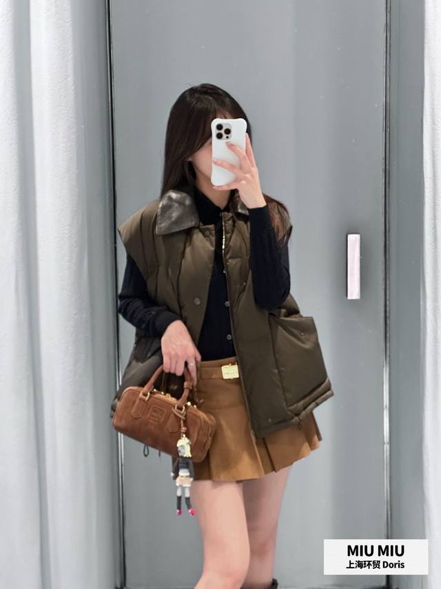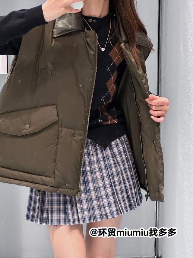 Miumi* 25Fw Autumn/Winter New Color-Blocked Genuine Leather Lapel Sleeveless Down Vest | Exclusive Yb Development! High-Quality Production! The color-blocked genuine leather lapel is the visual focus. The rugged texture of the dark brown leather contrasts sharply with the fluffy softness of the down fabric. The down filling is full yet not bulky, and the clean cut outlines a casual yet sophisticated silhouette. The large pocket design combines practicality and style, replicating the classic genes of retro workwear while breaking the monotony with Miu's sweet and cool style. The sleeveless silhouette allows for multiple layering options. Pair it with a white shirt for a fresh, preppy look, or with a black knit sweater for a French-inspired relaxed style, allowing you to freely explore the boundaries of style. Available now in sizes S, M, L,